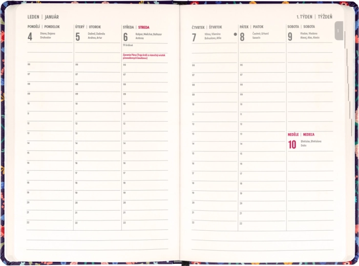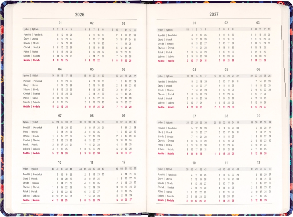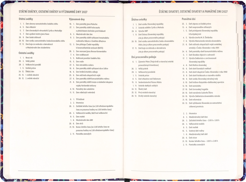 Štýlový diár Notique Petito Flóra spája praktické členenie týždňov do stĺpcov s jemným kvetinovým dizajnom. Vďaka prehľadom pre roky 2026 a 2027 a zoznamu českých a slovenských mien budete mať sviatky aj plánovanie vždy poruke.