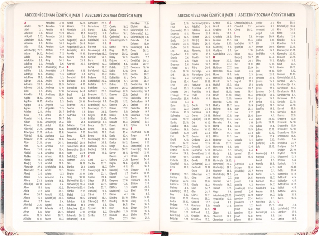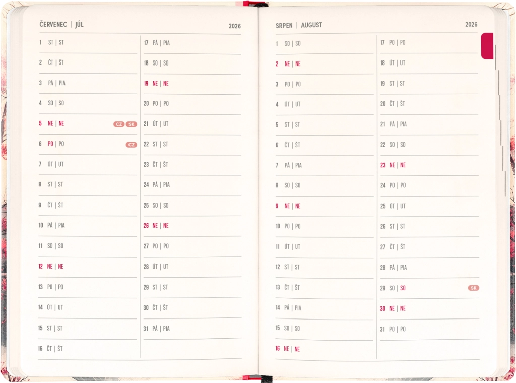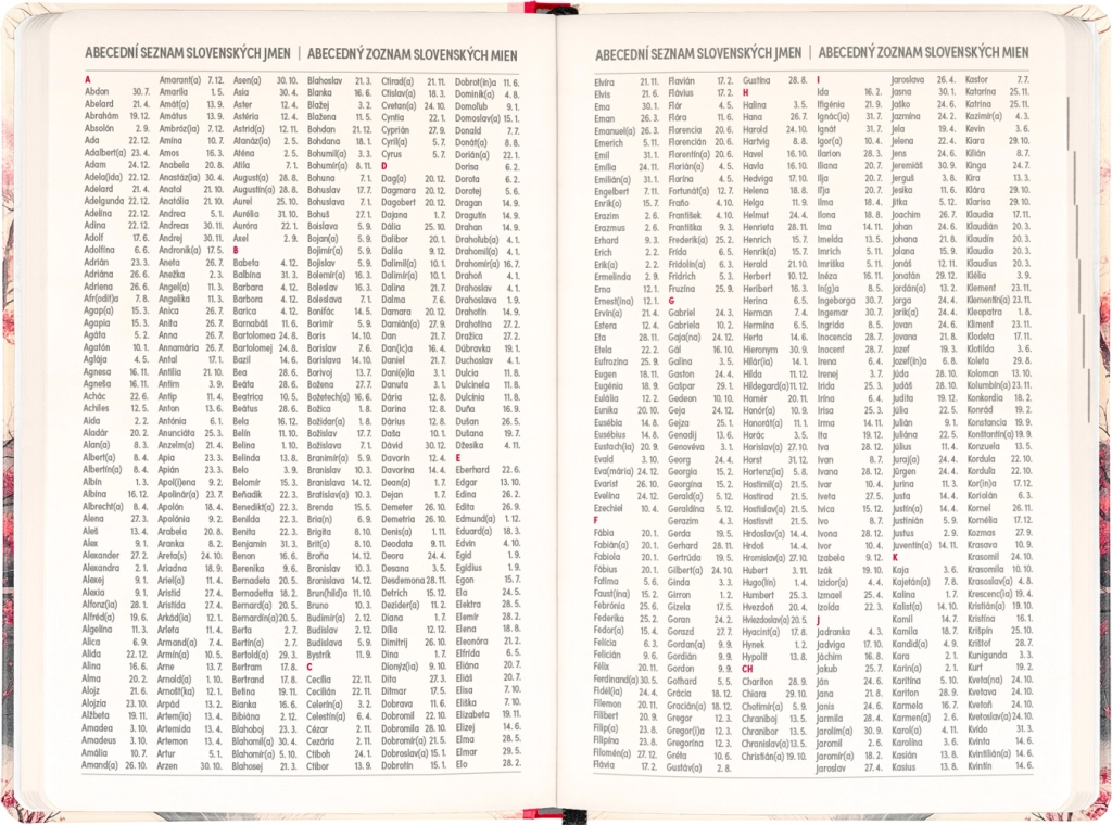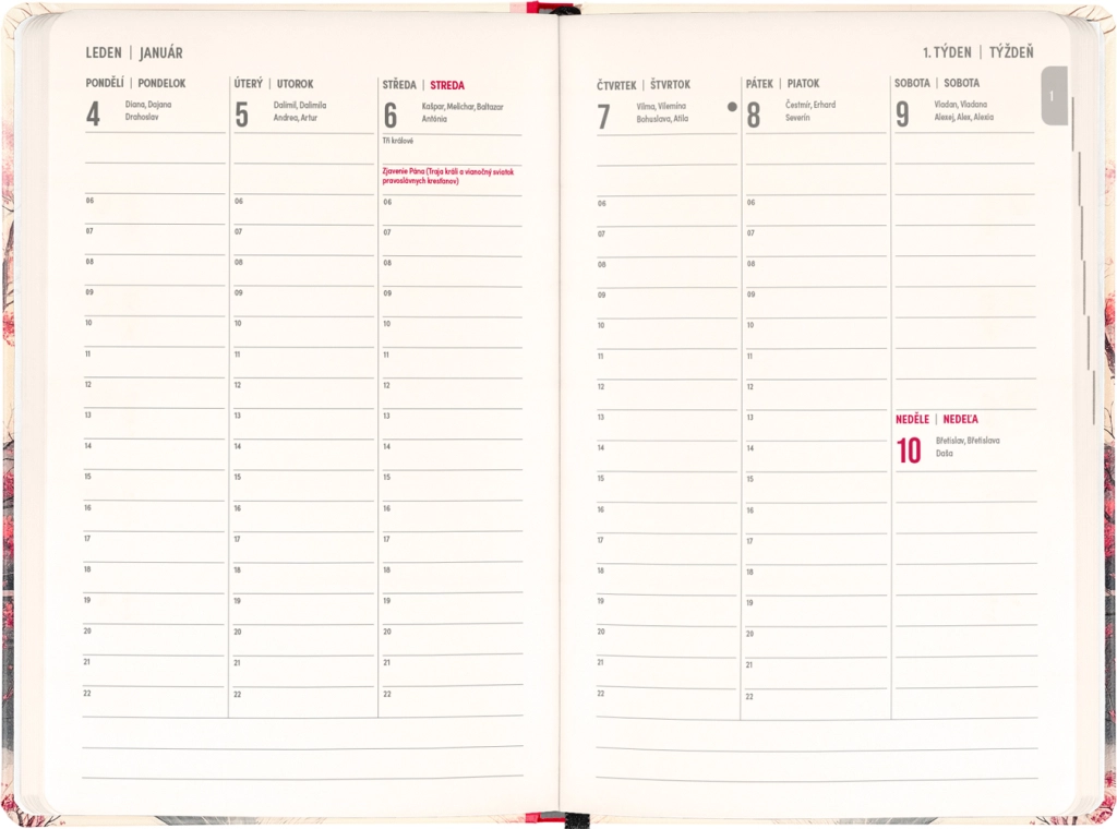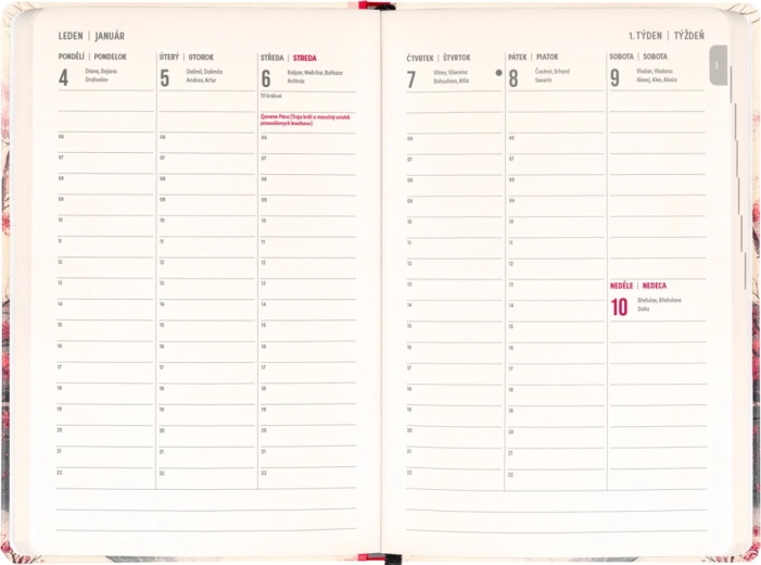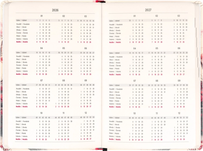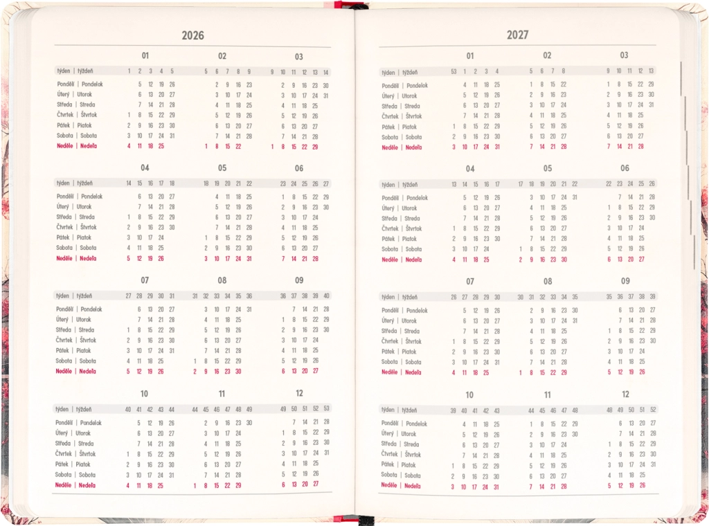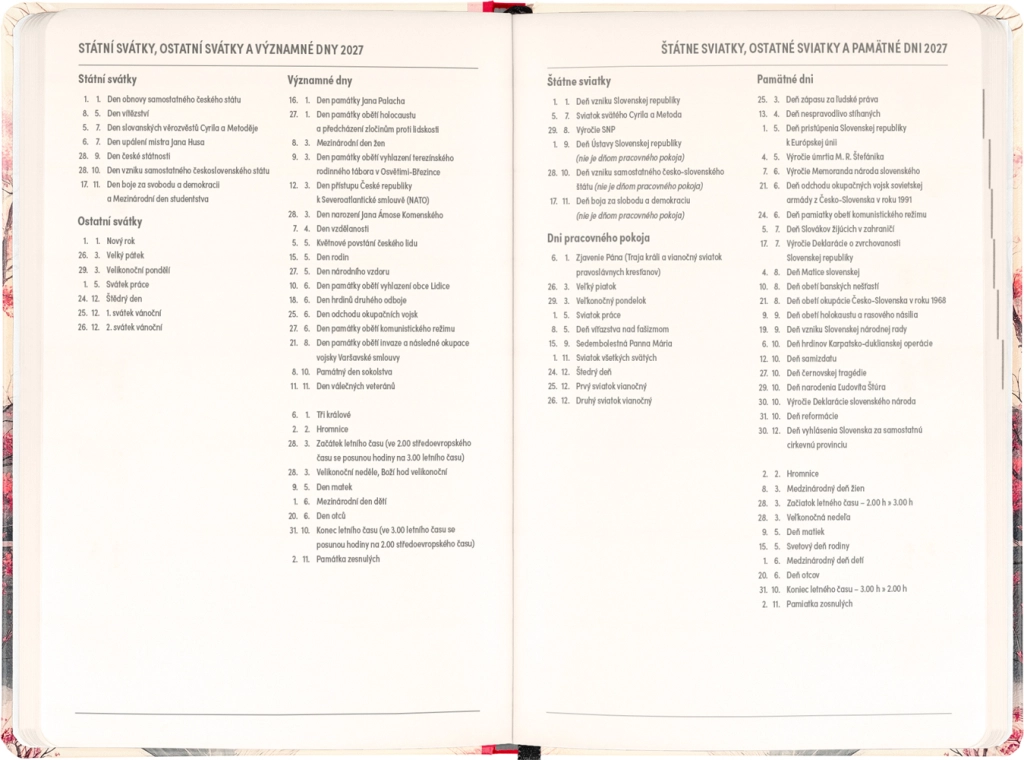 Diár myslí na každodenné plánovanie aj sviatočné chvíle: nájdete v ňom prehľad rokov 2026 a 2027, zoznam českých a slovenských mien a pripomienky sviatkov. Prehľadné stĺpce pre jednotlivé dni uľahčujú organizáciu práce, školy aj voľného času.