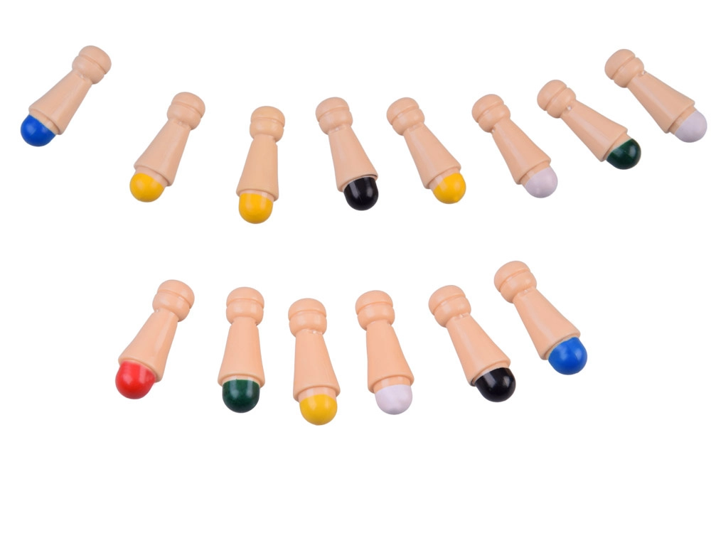 Pravidlá možno ľahko obmieňať: vyhráva ten, kto ako prvý nazbiera 4 kolíky rovnakej farby, alebo ten, kto získa 6 rôznych farieb, prípadne hráč s najväčším počtom kolíkov na konci hry. Prírodné drevo, hladké spracovanie a praktické textilné vrecúško na uloženie dielov robia z tejto hry odolného parťáka na každodenné hranie.
