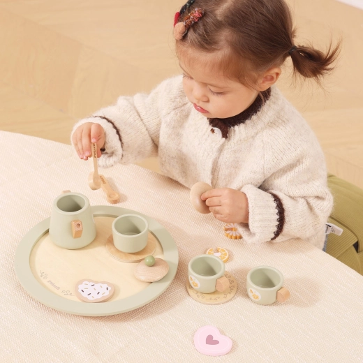 Kompletná výbava vrátane kanvičky, šálok, cukorničky, lyžičiek, dezertov a tácky motivuje deti k napodobňovacej hre, zdieľaniu a učeniu sa dobrým mravom.