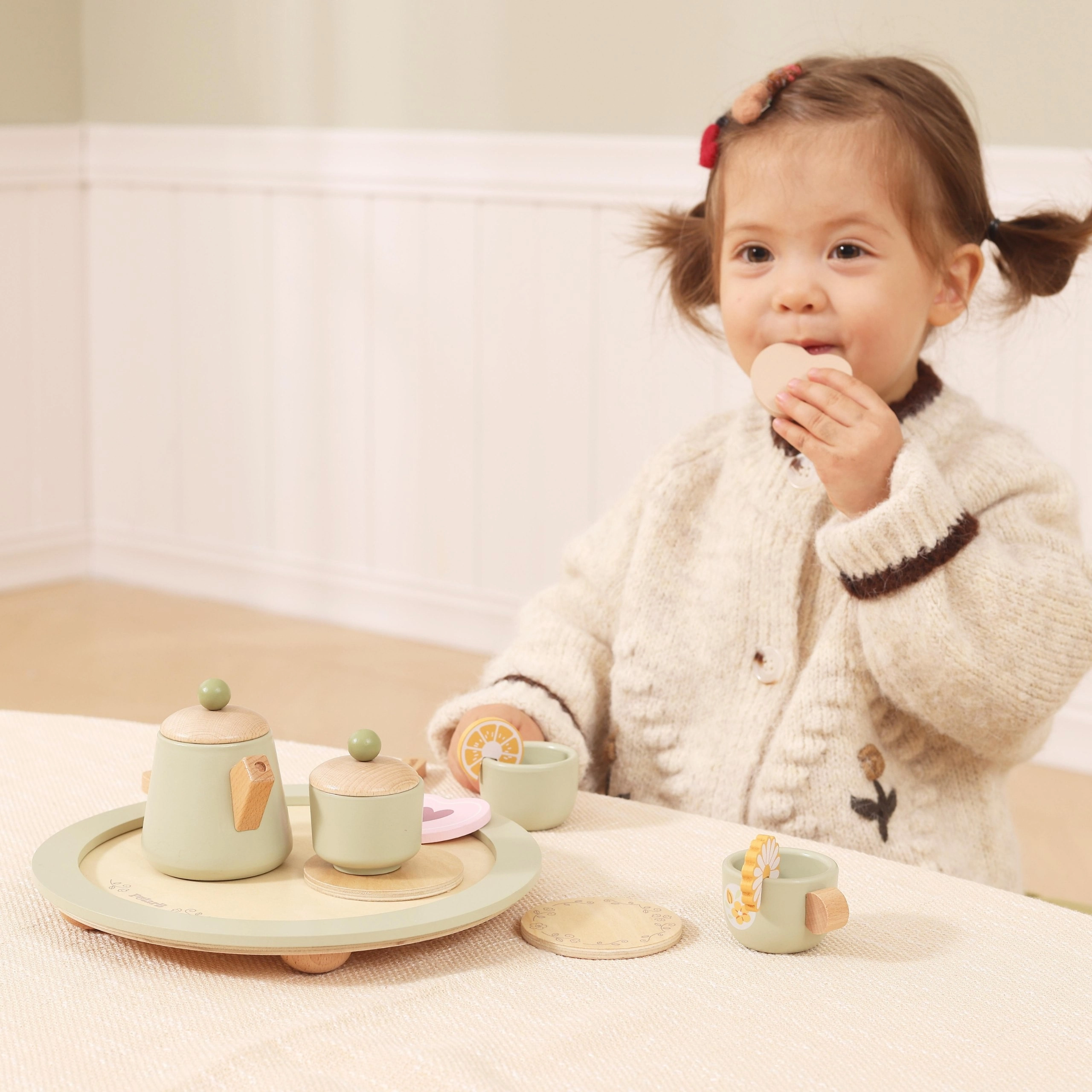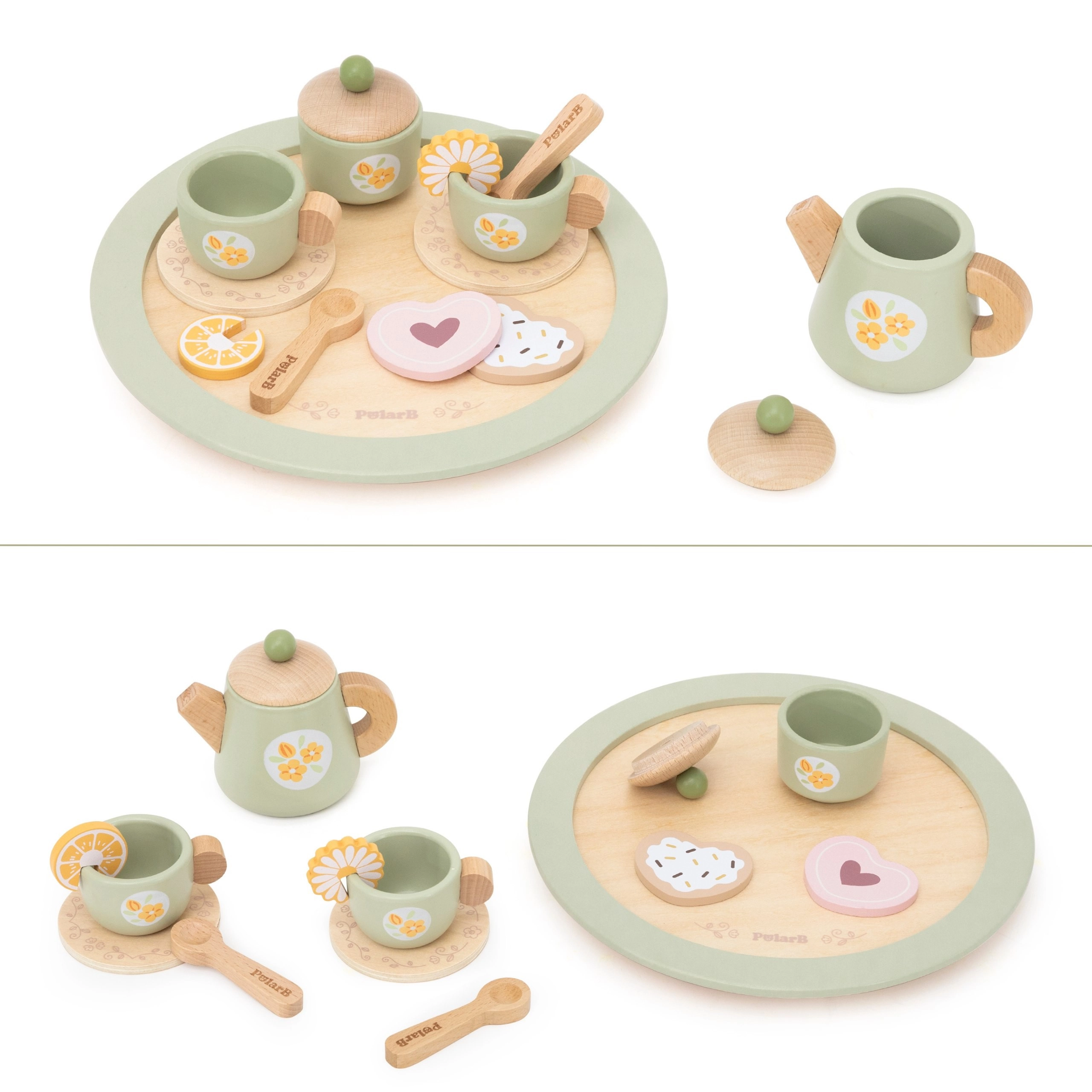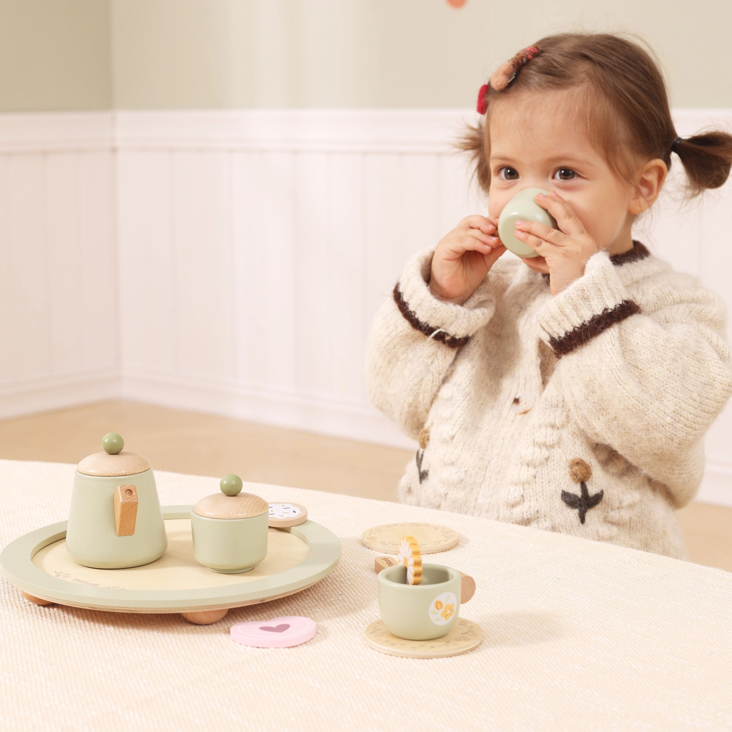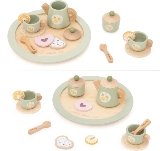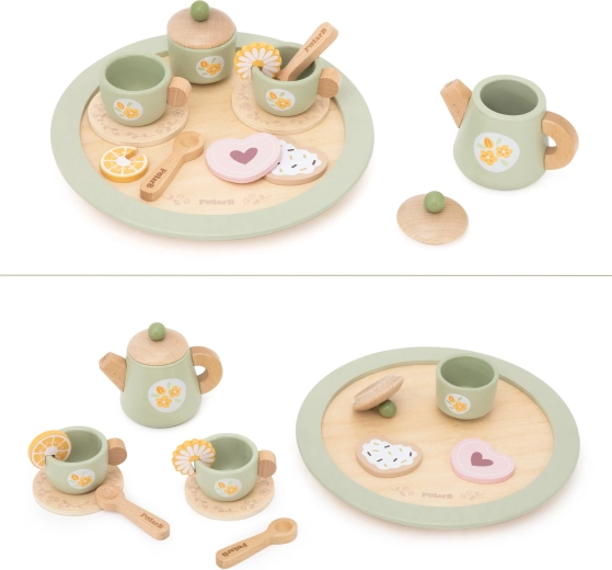 Súčasťou je všetko pre malý čajový posiedok: kanvička s viečkom, cukornička, 2 šálky s podšálkami, lyžičky, dezertný tanierik, plátky citróna a sušienky a predovšetkým stabilná okrúhla tácka na jednoduché servírovanie. Všetko je vyrobené z kvalitného dreva a opatrené netoxickými farbami bezpečnými pre deti od 3 rokov.
