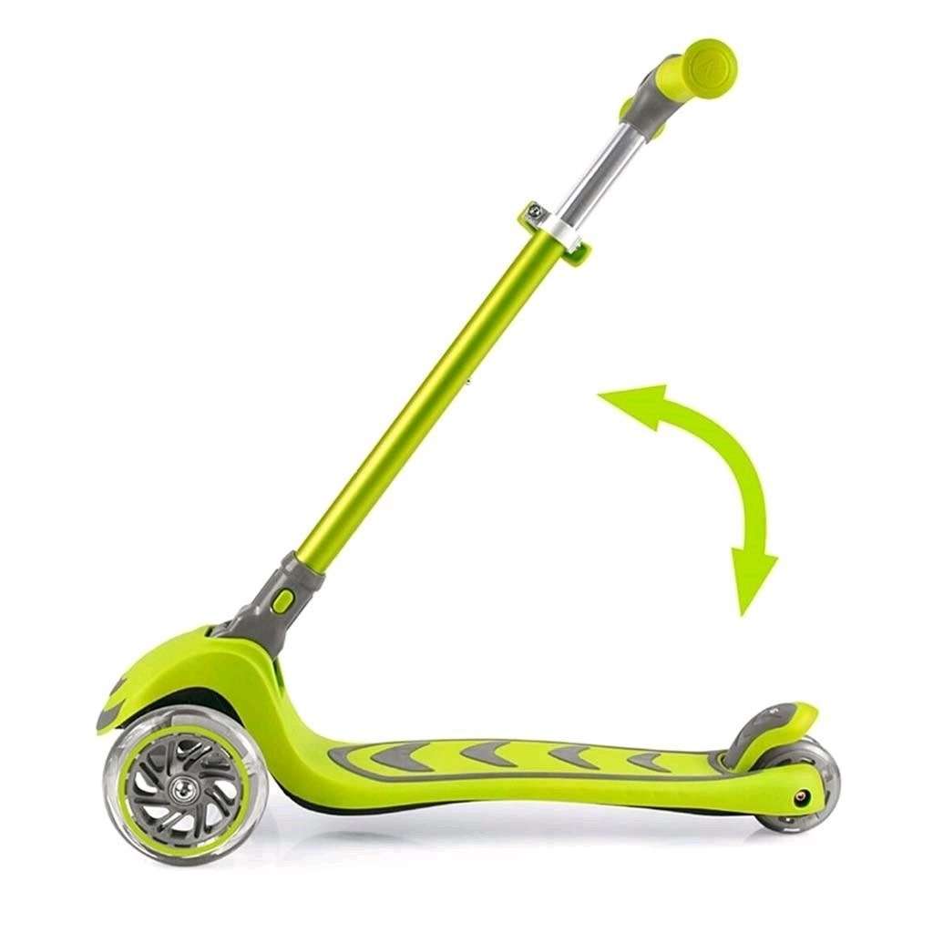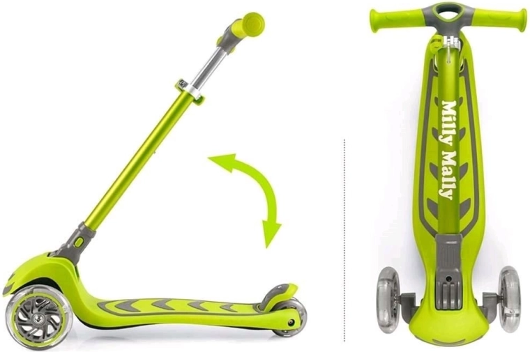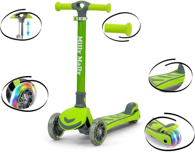 Ľahká a odolná detská kolobežka Milly Mally Boogie v zelenej farbe poteší malých jazdcov od 3 rokov. Ponúka stabilné trojkolesové prevedenie s dvojitým zadným kolieskom, svietiacimi prednými kolieskami a hliníkovou konštrukciou pre dlhú životnosť. Riadenie nakláňaním tela, výškovo nastaviteľné riadidlá a protišmyková nášľapná plocha zaistia bezpečnú a zábavnú jazdu.