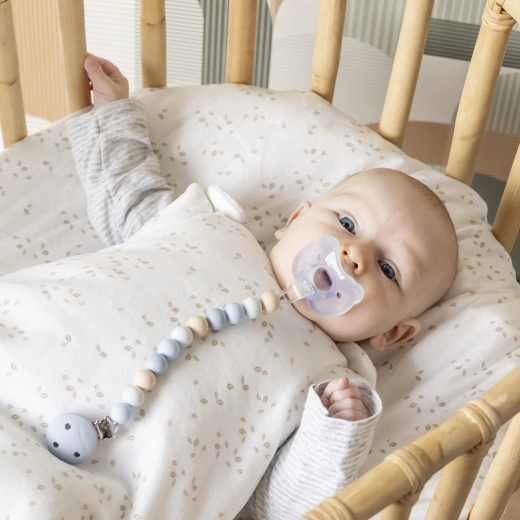 Kovová sponka spoľahlivo drží na oblečení či spacích vakoch, takže cumlík zostane čistý a vždy po ruke – doma aj na prechádzke.