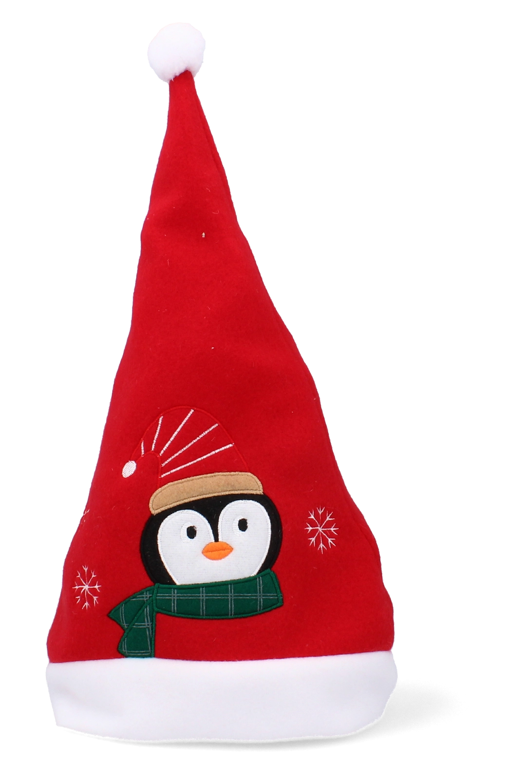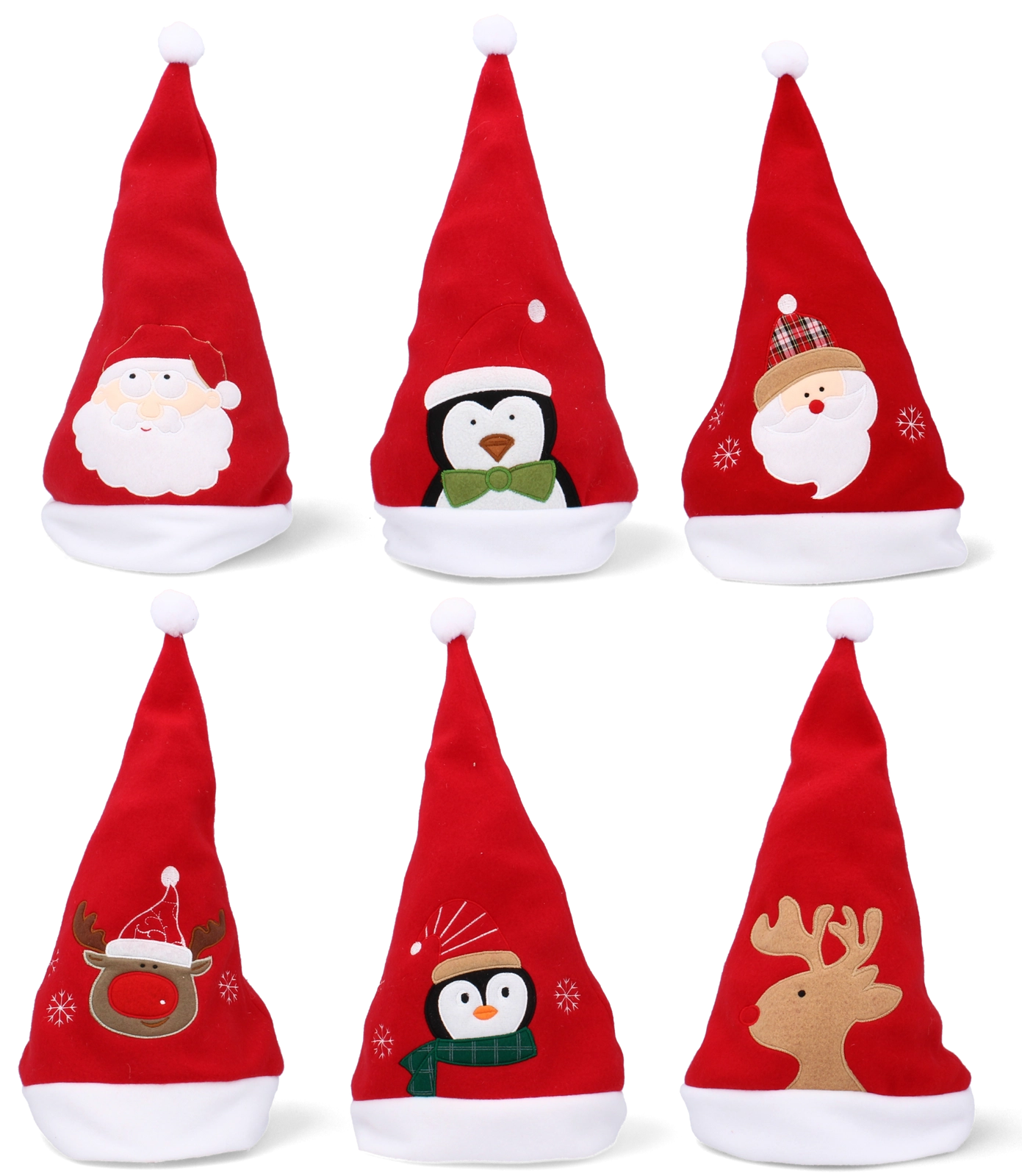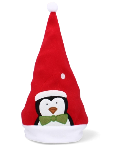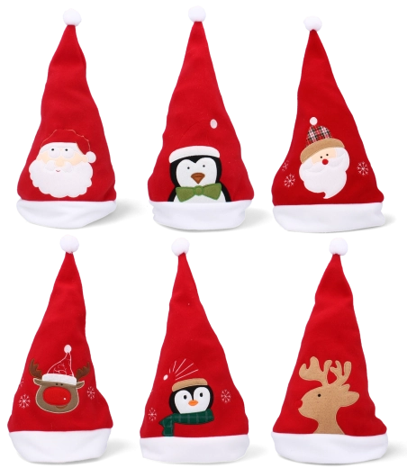 Dodajte Vianociam hravý nádych – červené čiapky Santa s bielym lemom a brmbolcom prinášajú okamžitú sviatočnú náladu. Každá čiapka je zdobená výraznou aplikáciou (Santa, tučniak, jeleň, vločky a pod.), vďaka čomu vyniknete na každej párty aj na rodinných fotkách.