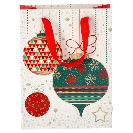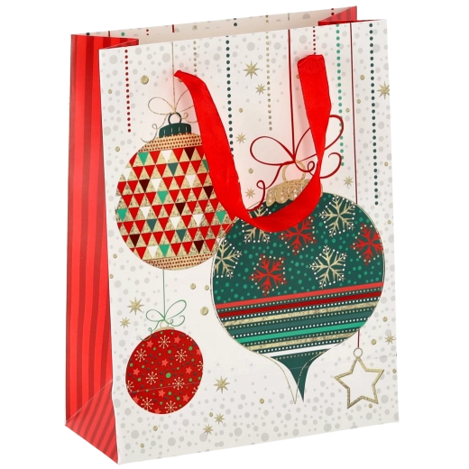 Elegantná vianočná darčeková taška s rozmermi 18 × 24 × 8 cm je ideálna na balenie menších darčekov, ako sú knihy, kozmetika či doplnky. Ponúka pevné rúčky, lesklý povrch a sviatočnú grafiku, ktorá dodá každému darčeku čarovnú atmosféru. Praktické balenie 12 kusov sa skvele hodí na rodinné aj firemné obdarúvanie.