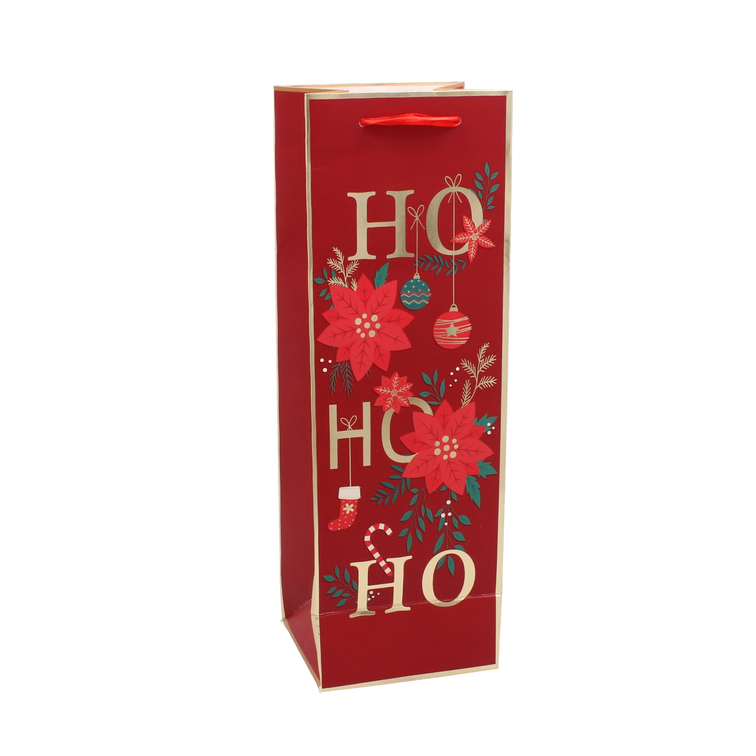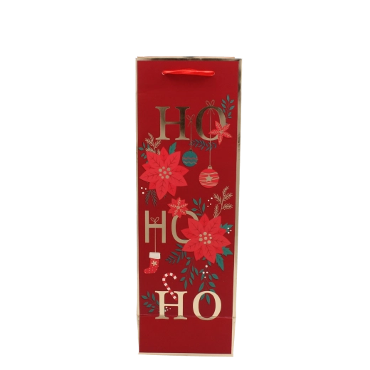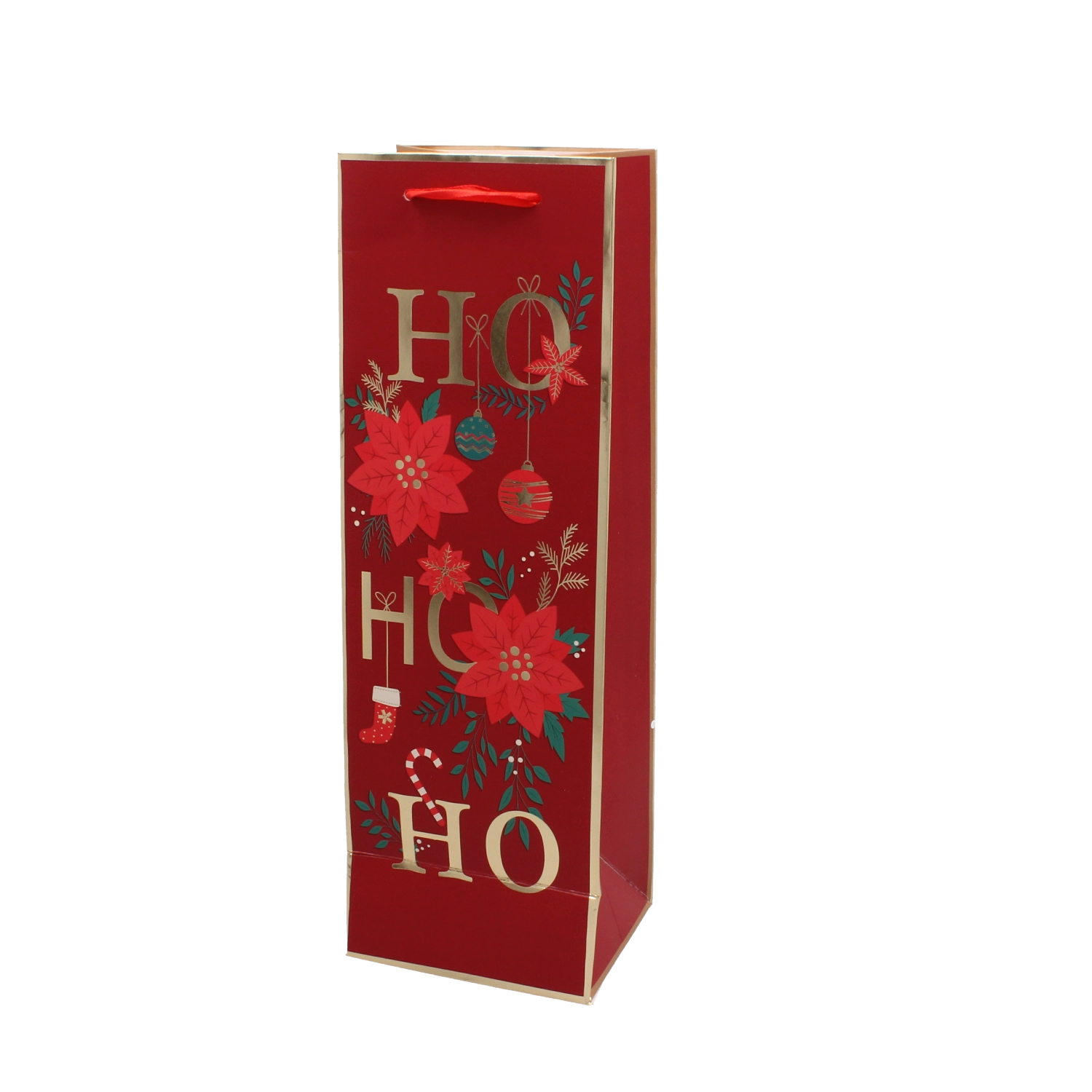 Červené prevedenie s kvetmi, ozdobami a zlatými nápismi Merry Christmas či HO HO HO dodá darčeku výnimočný vzhľad.