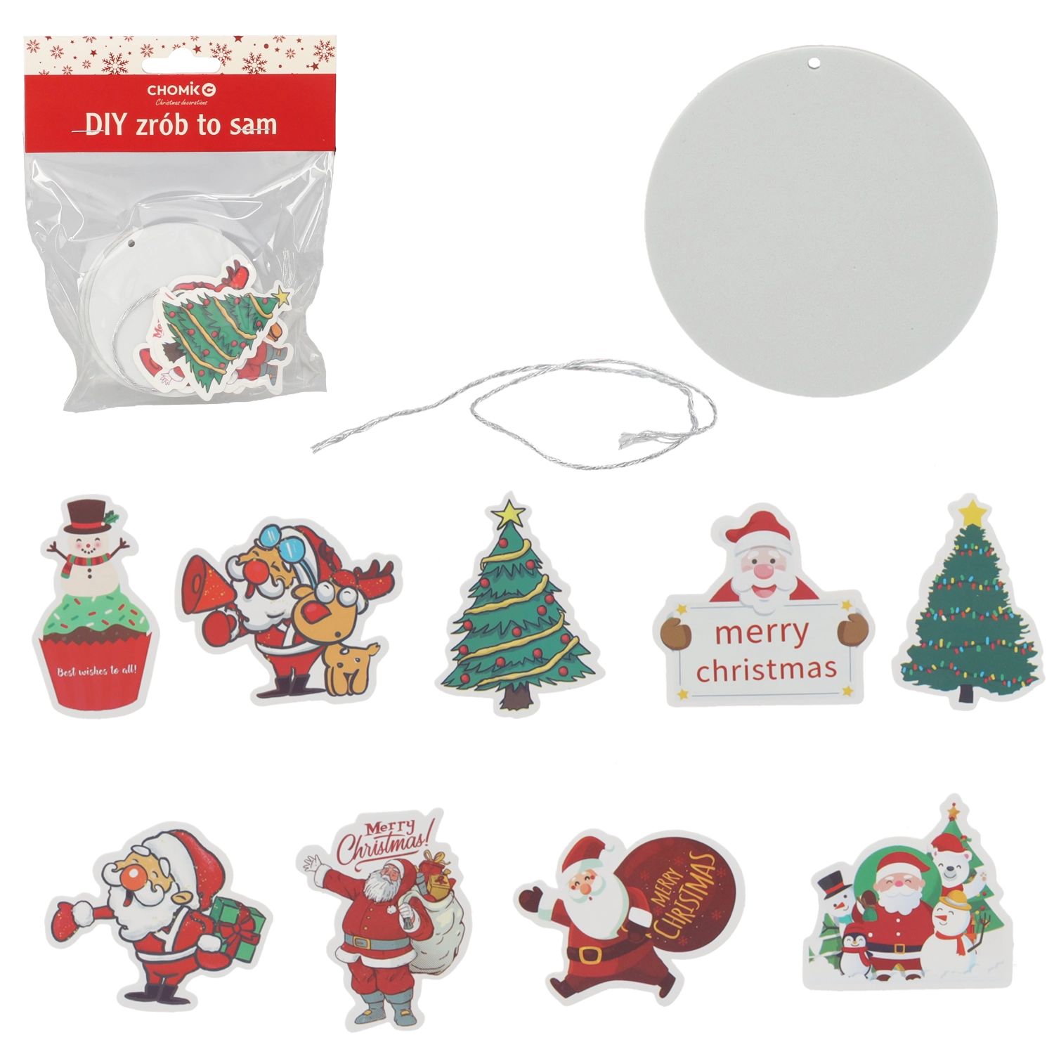 Vytvorte si vlastné vianočné dekorácie s kreatívnou sadou troch ozdôb na zavesenie. Každý kus má predvŕtaný otvor a šnúrku, takže je ihneď pripravený na stromček či darčeky. Súčasťou sú farebné samolepky s motívmi ako Santa, snehuliak a vianočný stromček, vďaka ktorým si ozdoby ľahko prispôsobíte. Skvelé na tvorenie s deťmi, rozvoj kreativity a ako originálny doplnok k baleniu darčekov.