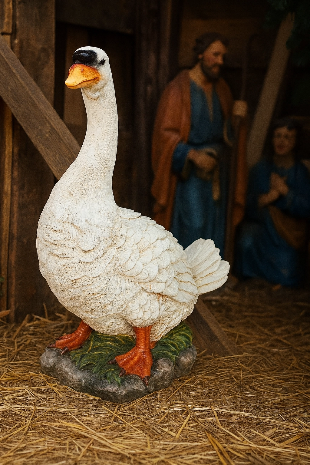 Vytvorte pôsobivú sviatočnú scénu s realistickou figúrkou husy 51 cm, ktorá skvele doplní betlehem, výklad alebo tematickú expozíciu. Precízna štruktúra peria, oranžový zobák a nohy aj prírodný podstavec s trávnatým motívom pôsobia autenticky a esteticky čisto.