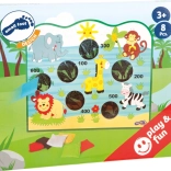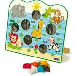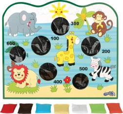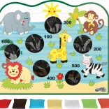 Hracia doska s farebnými ilustráciami zvierat a farebné vrecúška robia hru atraktívnou a zábavnou pre deti.
