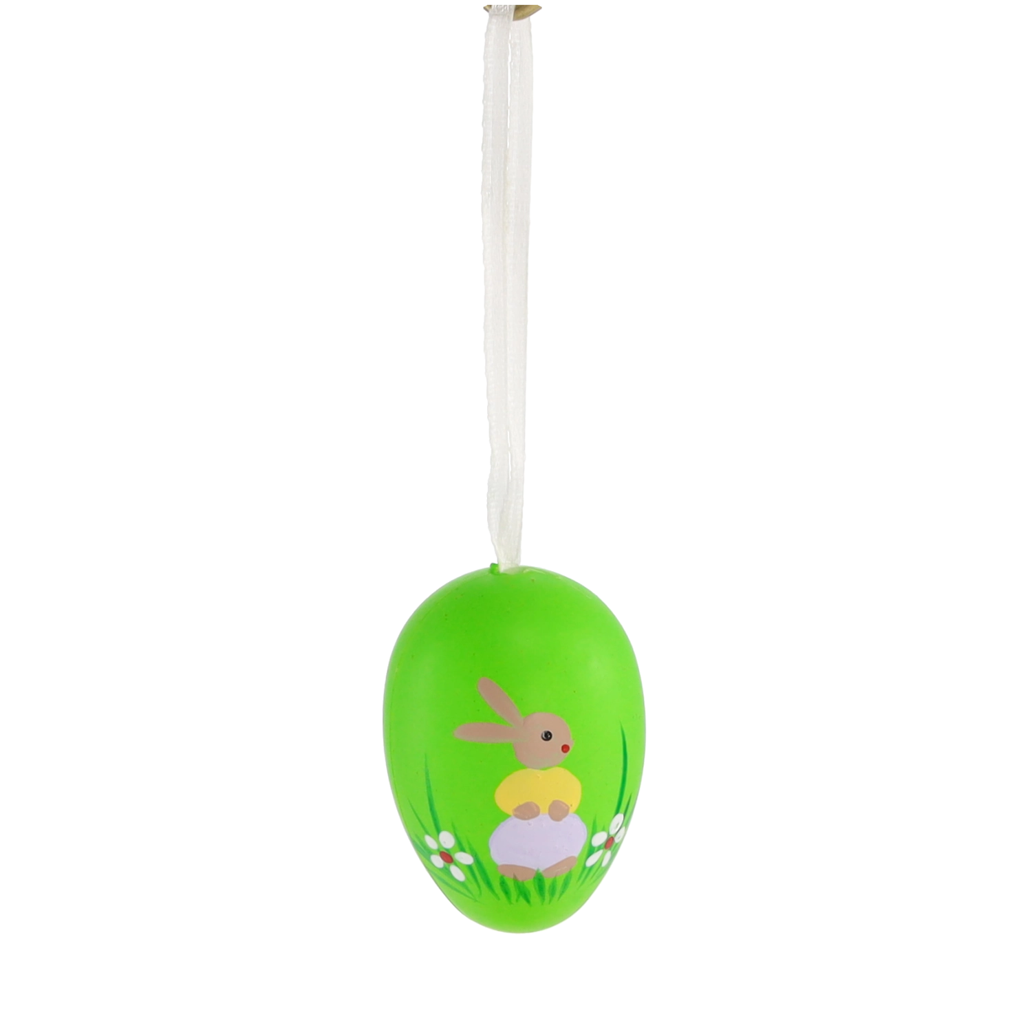 Táto elegantná sada ponúka 6 kusov plastových veľkonočných vajíčok vo veľkosti 4 × 6 cm. Každé je ozdobené roztomilým motívom zajačika v tráve a je vybavené stuhou na zavesenie. Pastelové odtiene žltej, zelenej a levanduľovej podčiarknu jarnú náladu a ľahko sa kombinujú s ďalšou výzdobou.