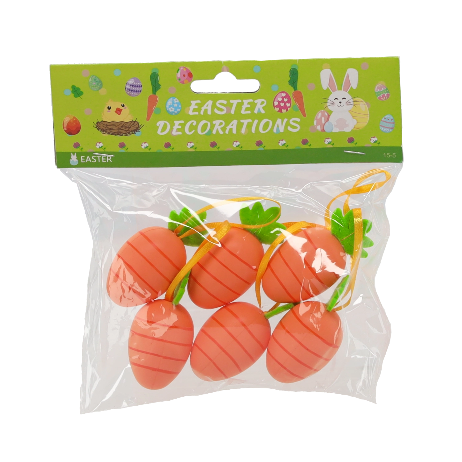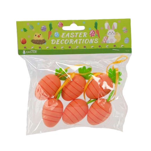 Ozdobte svoj domov jarnou a veľkonočnou atmosférou so súpravou šiestich dekoračných mrkiev s pútkom. Tieto malé mrkvičky majú realistický vzhľad, živé farby a vďaka pútku ich ľahko zavesíte na vetvičky, vence či iné dekorácie. Sú ľahučké, odolné a skvele sa hodia na interiérovú výzdobu.