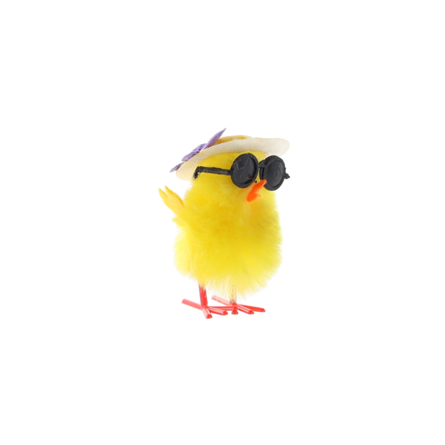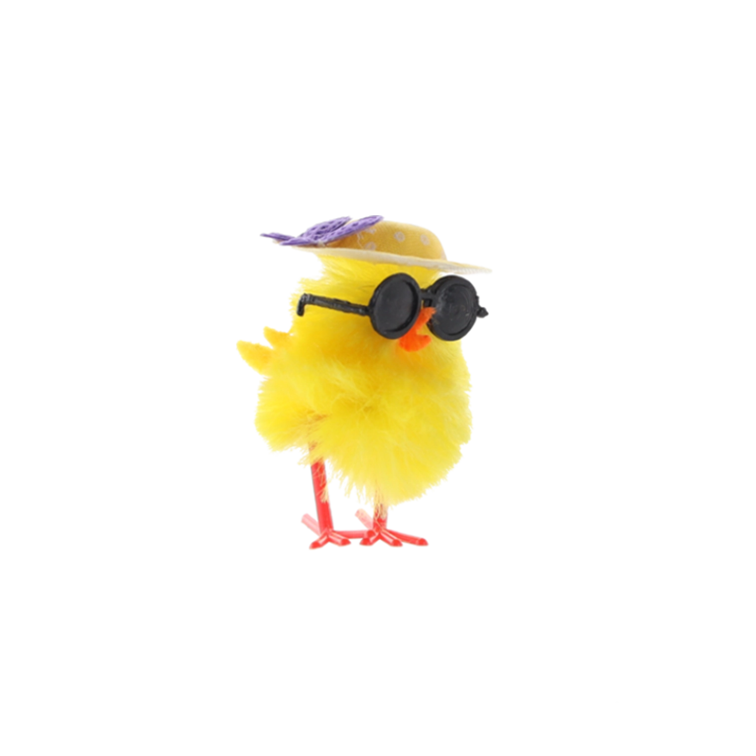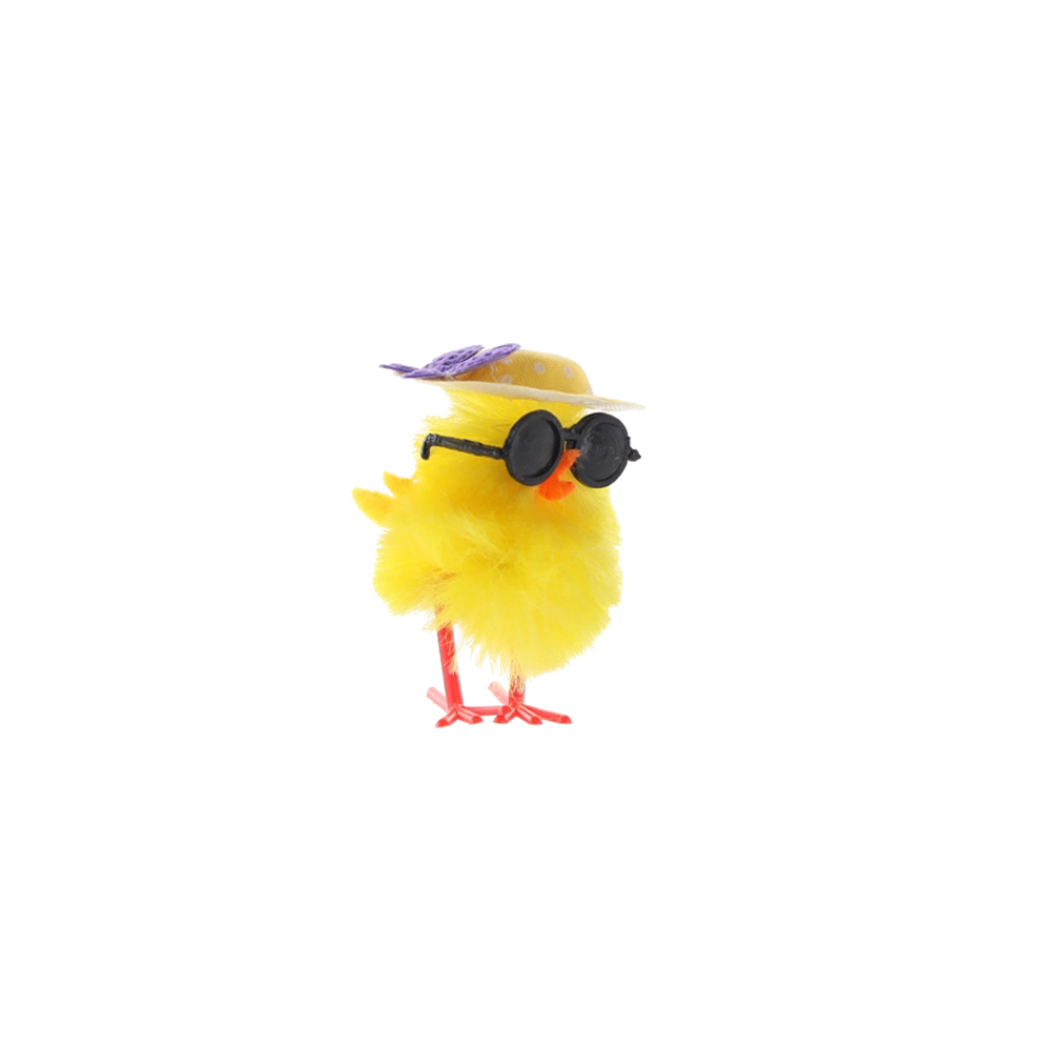 Čierne okrúhle slnečné okuliare a štýlový klobúčik dodávajú kuriatkam jedinečný šarm – perfektný akcent do každého veľkonočného aranžmánu.
