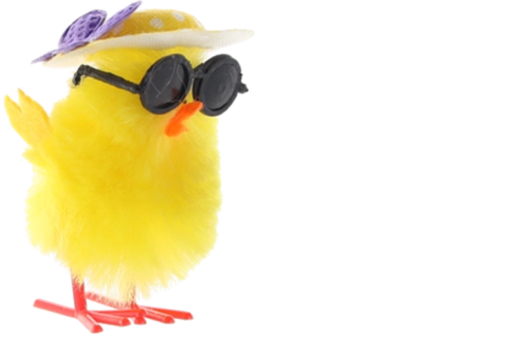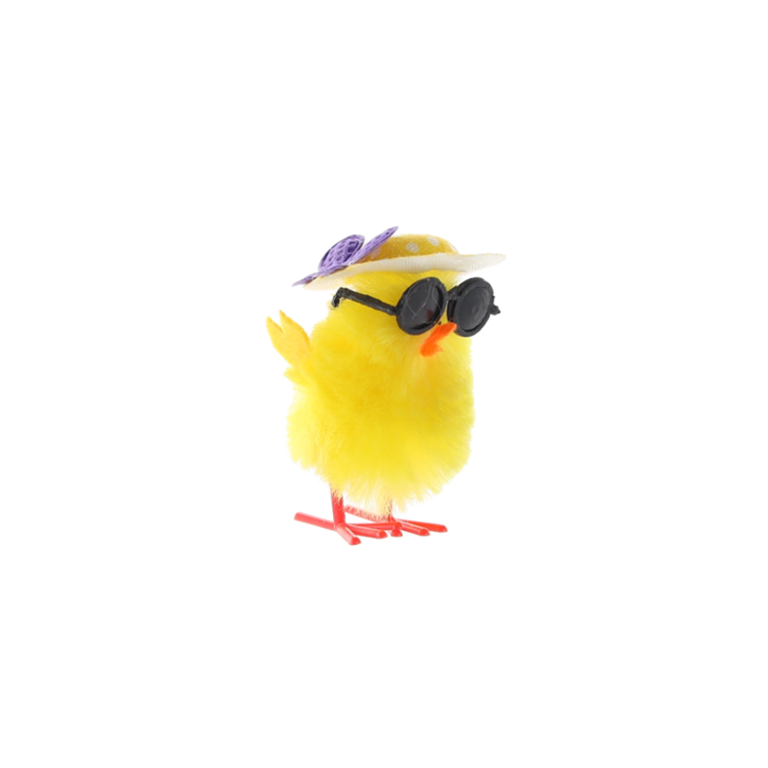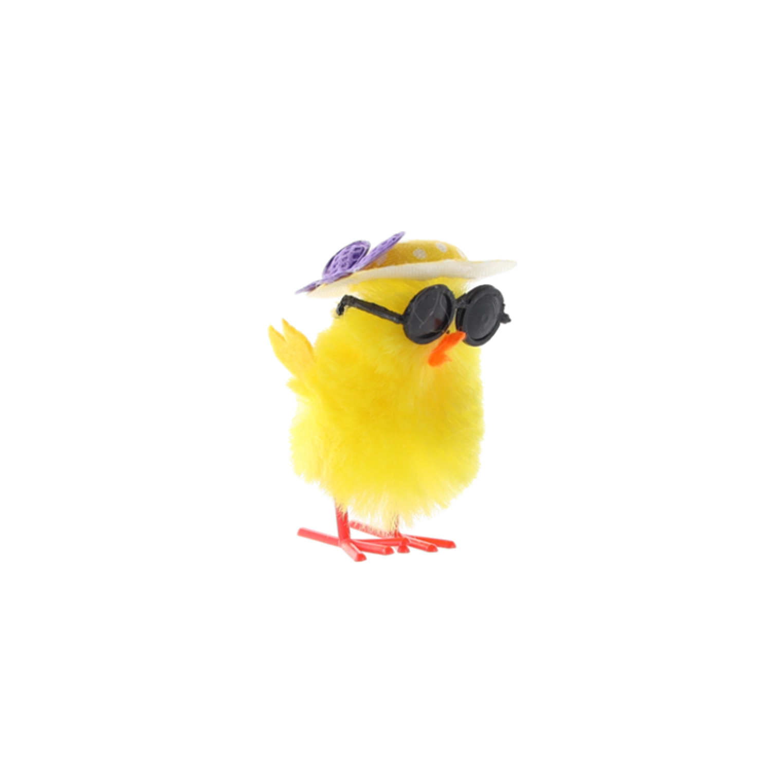 Čierne okrúhle slnečné okuliare a štýlový klobúčik dodávajú kuriatkam jedinečný šarm – perfektný akcent do každého veľkonočného aranžmánu.