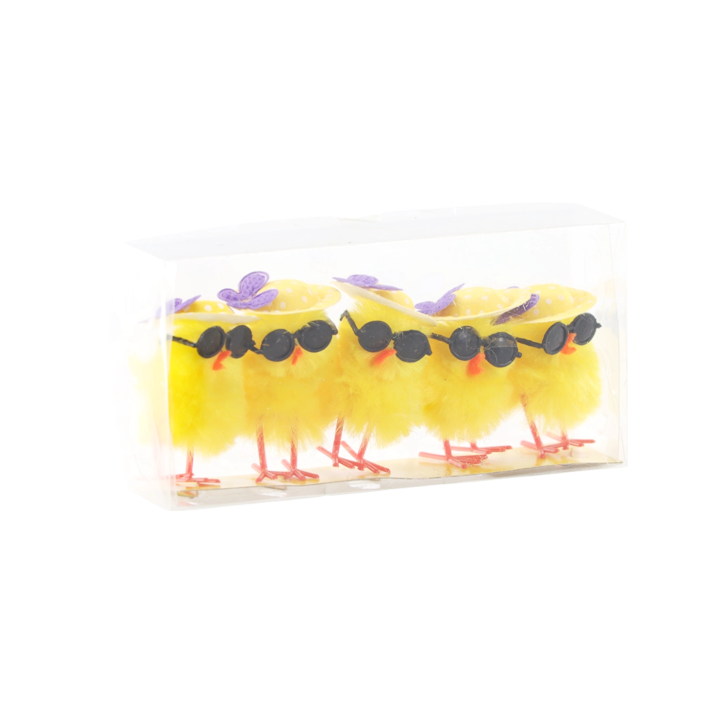 Sada piatich veľkonočných ozdôb v podobe kuriatok so slnečnými okuliarmi a kontrastnými doplnkami prináša do interiéru veselú, sviežu atmosféru. Ľahký plast s nadýchaným efektom pôsobí na pohľad aj dotyk hravo a zároveň je odolný na opakované použitie.
