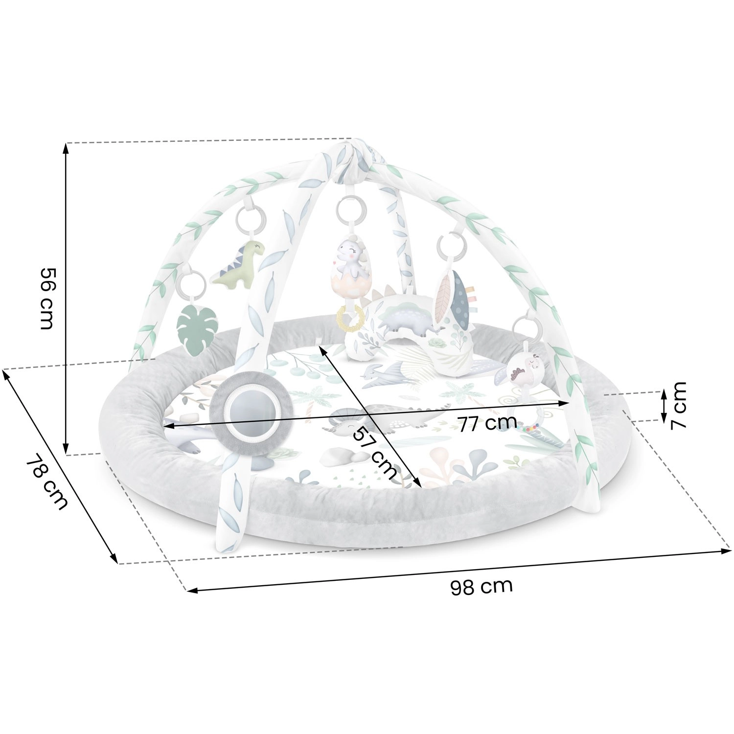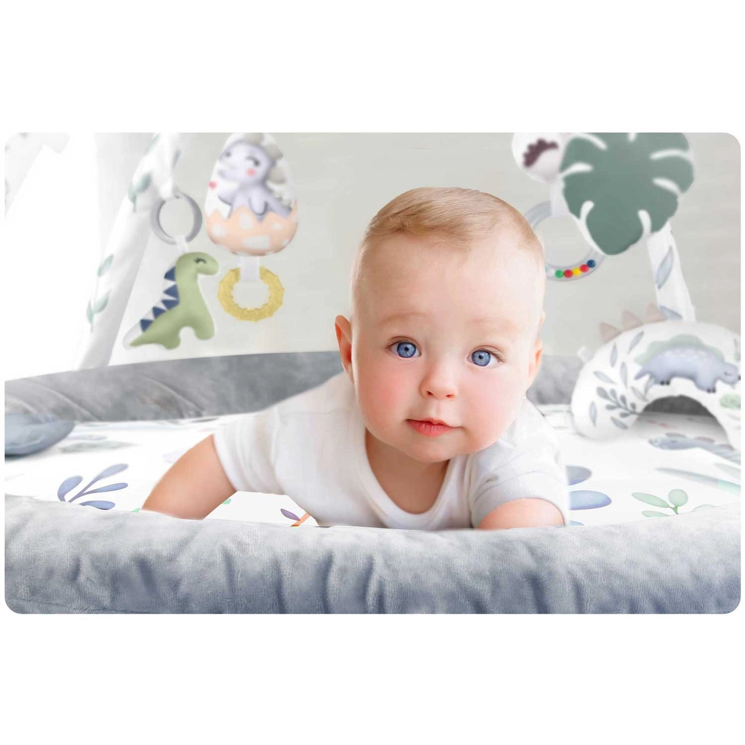 Dva krížové oblúky sú odnímateľné pre dlhšie využitie deky – ako hracej plochy aj samostatného hniezdočka. Súčasťou je mäkučký vankúšik (zadná strana z minky) ideálny na „tummy time“, na ktorý možno pripnúť hračky. Rôznorodé textúry, šuštiace detaily, hrkálky, hryzadlá a pískajúci dinosaurus spoločne rozvíjajú jemnú motoriku, koordináciu oko–ruka aj sluchové a hmatové vnemy.