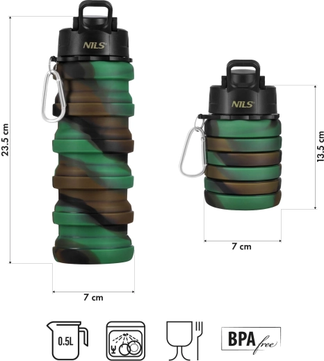 Skladacia silikónová fľaša NILS Camp 500 ml je navrhnutá pre maximálnu úsporu miesta a pohodlie na cestách. Po rozložení meria 23,5 cm, po zložení iba 13,5 cm – ideálna do batohu, kabelky aj príručnej batožiny do lietadla. Odolný potravinársky silikón bez BPA s certifikáciou LFGB zaručuje bezpečný kontakt s nápojmi bez nežiaducich pachutí a uvoľňovania škodlivín.