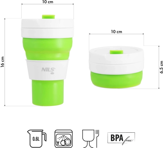 Ľahký a praktický skladací hrnček s objemom 600 ml je ideálny na cesty, turistiku aj do mesta. Vďaka pružnému silikónu sa zloží na výšku len 6,5–7 cm, takže nezaberie miesto v batohu. Je vyrobený z bezpečného LFGB silikónu bez BPA, má stabilnú širokú základňu, viečko s pítkom proti rozliatiu a nízku hmotnosť 205 g pre pohodlné nosenie.