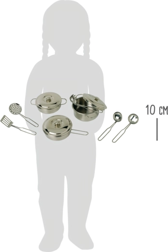 Detská sada kovových riadov Profi ponúka realistický zážitok z varenia v bezpečnom prevedení pre deti od 3 rokov. Kvalitné kovové prevedenie a premyslené rozmery zaručujú pohodlné uchopenie a dlhú životnosť. Vďaka všestrannému vybaveniu môžu malí kuchári pripravovať „pochúťky“ rovnako ako dospelí.