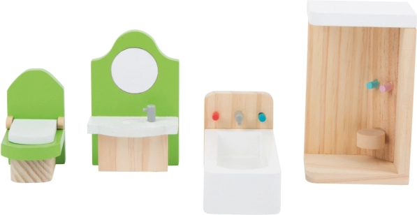 Štýlová sada kúpeľňového nábytku do domčeka pre bábiky poteší všetkých malých staviteľov. Obsahuje sprchovací kút, vaňu, umývadlo so zrkadlom a WC v príjemnej kombinácii zelenej a prírodného dreva. Je vyrobená z masívneho dreva pre dlhú životnosť a bezpečnú hru. Podporuje fantáziu a jemnú motoriku a je vhodná pre ohybné bábiky do 12 cm.