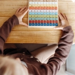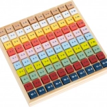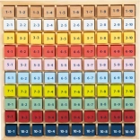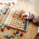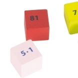 Farebné drevené kocky s príkladmi motivujú deti k objavovaniu a opakovaniu násobilky každý deň.