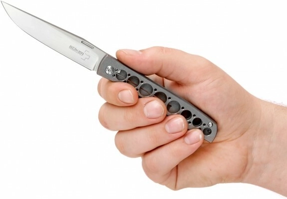 Skeletizovaná titánová rukoväť s odľahčovacími otvormi udržiava hmotnosť na minime a zabezpečuje príjemný úchop pri každodennom nosení.