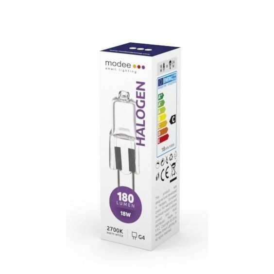 Halogénová žiarovka MODEE G4 18 W je ideálna náhrada pre dekoratívne aj funkčné osvetlenie v lustroch, lampách a vstavaných svietidlách. Prináša príjemné teplé biele svetlo (2700 K), je stmievateľná a svieti okamžite po zapnutí bez oneskorenia.