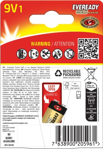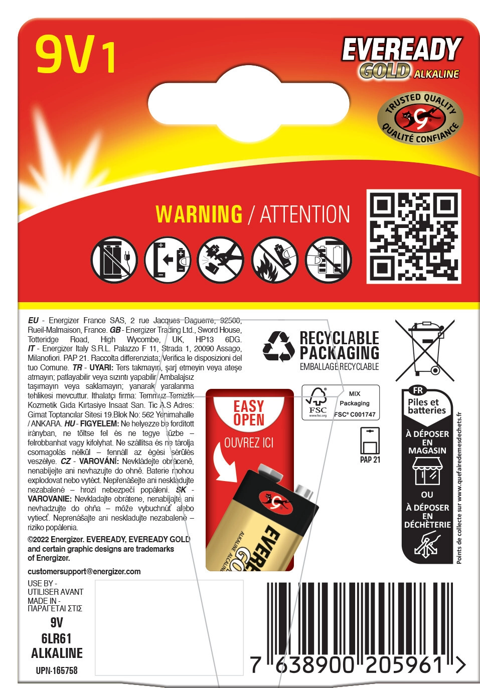 Alkalická batéria 9V ENERGIZER EVEREADY GOLD je navrhnutá tak, aby spoľahlivo napájala bežnú domácu elektroniku so strednou spotrebou. Kombinuje stabilné napätie 9 V, dlhú výdrž a zvýšenú odolnosť proti vytečeniu, takže vaše zariadenia budú fungovať bez starostí.