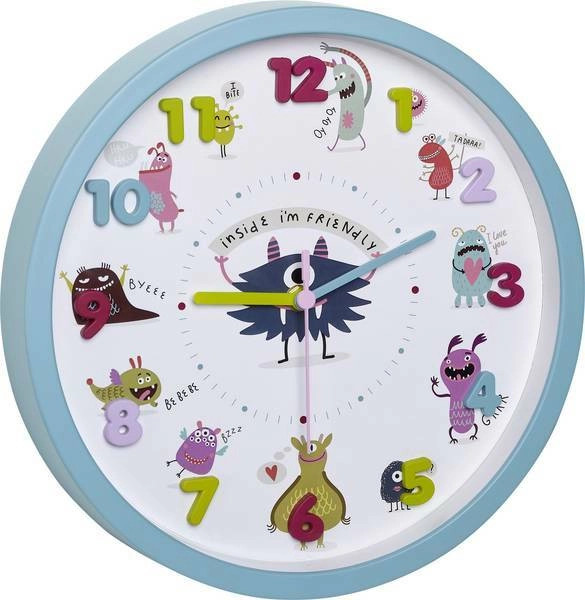 Veselé detské nástenné hodiny TFA Little Monsters s tyrkysovým ciferníkom a plastickými 3D číslicami uľahčujú deťom učenie sa času. Každú hodinu sprevádza vlastné monštrum, ktoré hravou formou podporuje plánovanie dňa. Hodiny majú tichý chod, jasné farby a značenie minút pre ľahké čítanie v detskej izbe aj v škôlke.