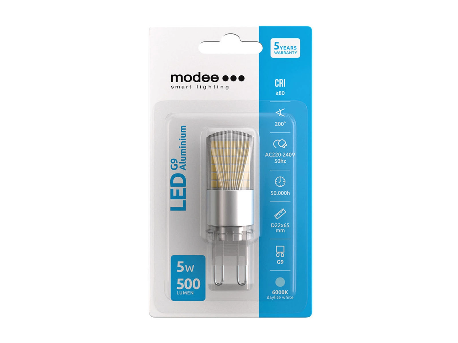 Úsporná LED žiarovka Modee Smart G9 5 W so studenou bielou farbou svetla 6000 K ponúka svetelný tok 500 lm, široký uhol svietenia 200° a dlhú životnosť až 50 000 h. Vďaka vysokej svetelnej účinnosti >100 lm/W šetrí energiu, zatiaľ čo sklenený kryt a hliníková základňa zaisťujú spoľahlivú prevádzku.