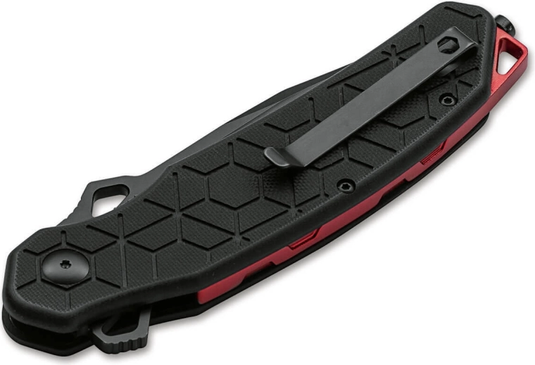 Ergonomická rukoväť z G10 s výraznou textúrou včelieho plástu poskytuje bezpečný úchop aj v rukaviciach alebo za mokra. Dizajn dopĺňa červený hliníkový rozper, otvor pre šnúrku, praktická vrecková spona a integrovaný rozbíjač skla pre núdzové situácie. Nôž je dodávaný v kvalitnom nylonovom puzdre, ktoré uľahčuje prenášanie a ochranu nástroja.