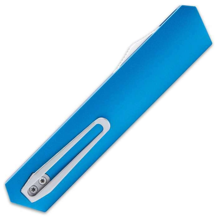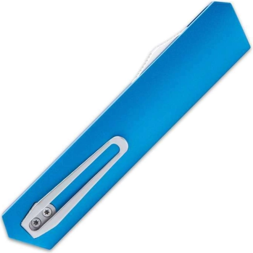 Rukoväť je vyrobená z CNC frézovaného hliníka v atraktívnej modrej farbe, poskytuje istý úchop a zároveň si zachováva nízku hmotnosť. Praktický vreckový klip uľahčuje nosenie a rýchle použitie, zatiaľ čo nylonové puzdro chráni nôž pri preprave.
