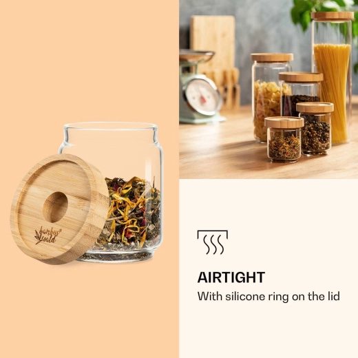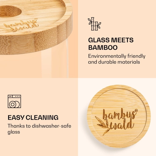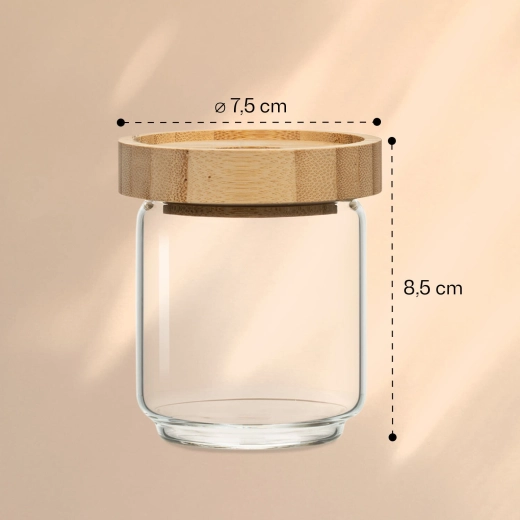 Štýlové a praktické skladovanie potravín doma aj v kancelárii: okrúhla sklenená nádoba Klarstein s bambusovým viečkom s objemom 200 ml je ideálna na kávu, oriešky, müsli či sušené ovocie. Vďaka silikónovému tesneniu zostáva obsah vzduchotesne uzavretý, dlho si uchová čerstvosť, chuť aj arómu a nádoby možno prakticky stohovať pre úsporu miesta. Sklenenú časť môžete umývať v umývačke riadu pre jednoduchú údržbu.