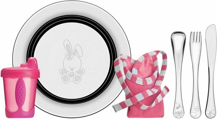 - Detský nerezový príbor (vidlička, lyžička, nožík), detský nerezový tanier, detský podbradník, uzatvárateľný plastový pohárik 200 ml