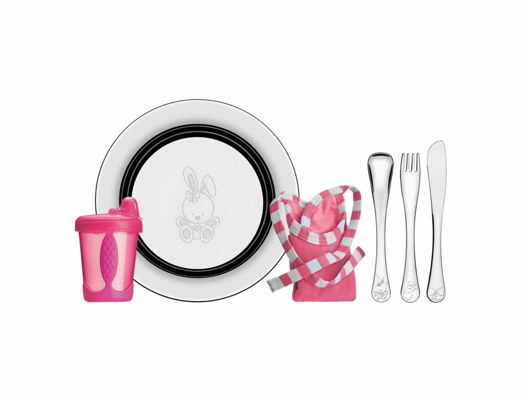 Roztomilá a praktická detská jedálenská sada Tramontina Le Petit v ružovej farbe ponúka všetko, čo malý stravník potrebuje. Obsahuje nerezový príbor (vidličku, lyžičku a nožík), nerezový tanier, mäkký podbradník a uzatvárateľný plastový pohárik 200 ml z polypropylénu bez BPA. Veselé zdobené rúčky podporujú samostatné stolovanie a jednoduchú údržbu.