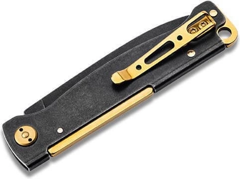 Oceľová rukoväť s povrchom Blackwash doplnená mosadznými detailmi dodáva nožu nadčasový vzhľad, ktorý zapasuje do vrecka džínsov aj k saku. Praktický vreckový klip a otvor na šnúrku zvyšujú komfort nosenia a rýchlu dostupnosť.