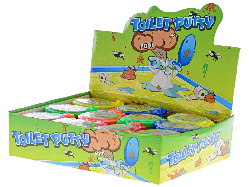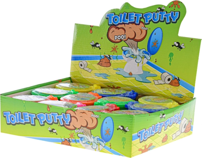 Vtipné balenie v tvare toalety dodáva hre šmrnc a zároveň prakticky uchováva sliz čerstvý a pripravený na ďalšie stláčanie.