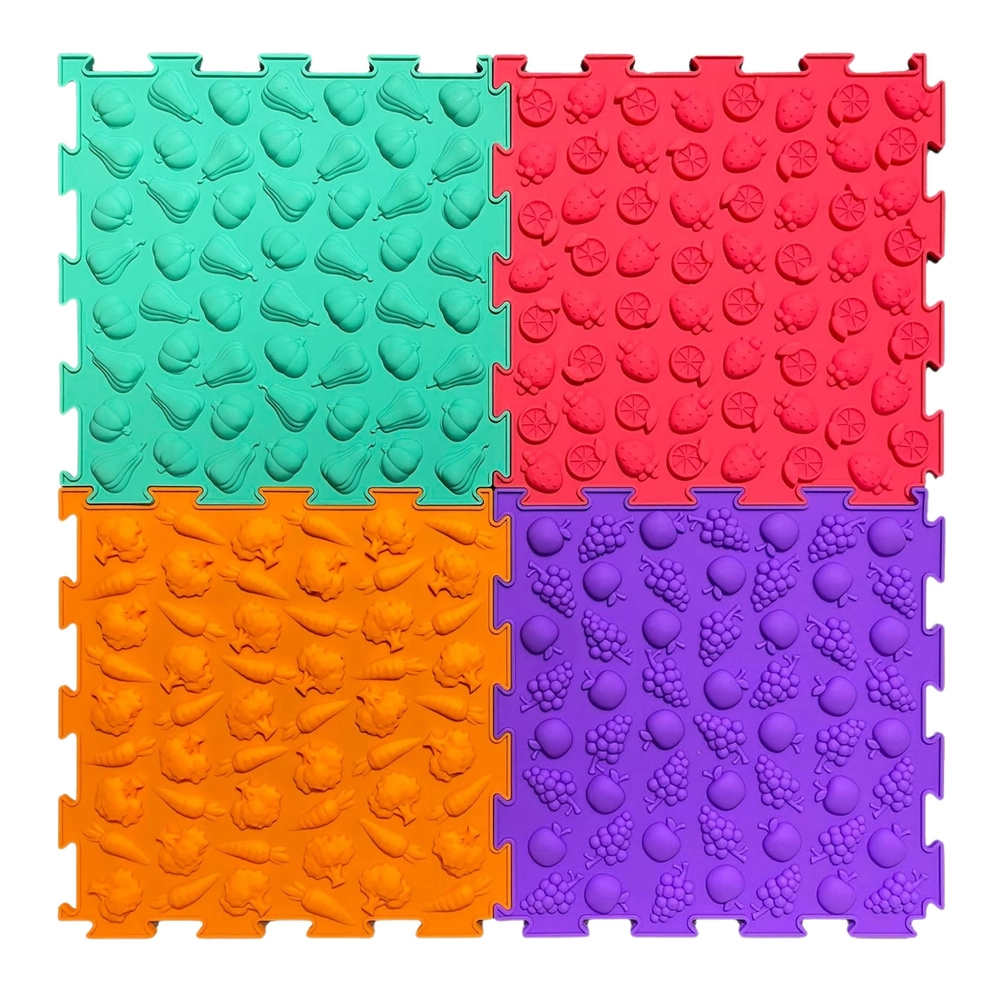 Každá dlaždica má inú štruktúru a reliéf (ovocie, zelenina a hravé vzory), ktoré jemne masírujú chodidlá, podporujú krvný obeh a rozvíjajú hmat.