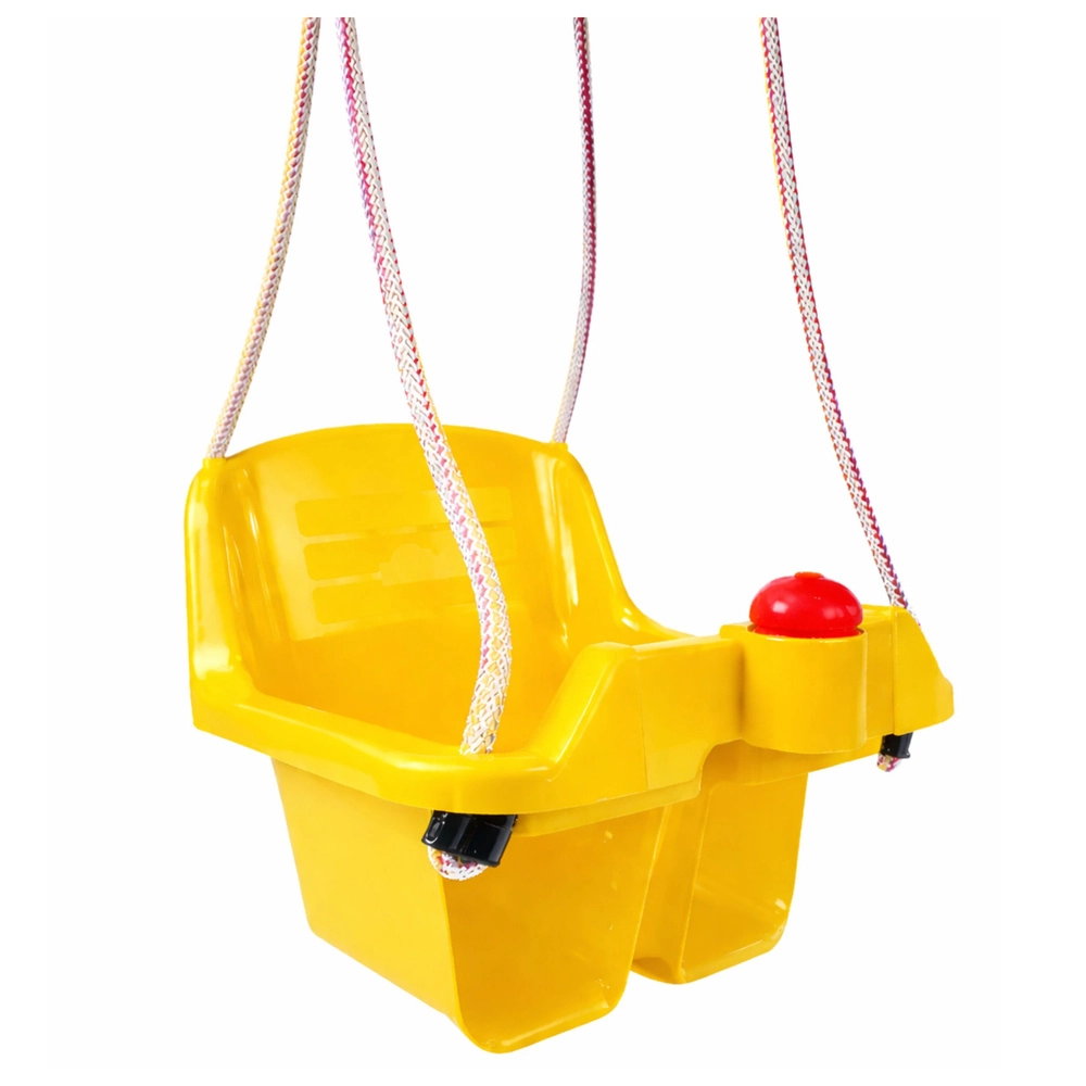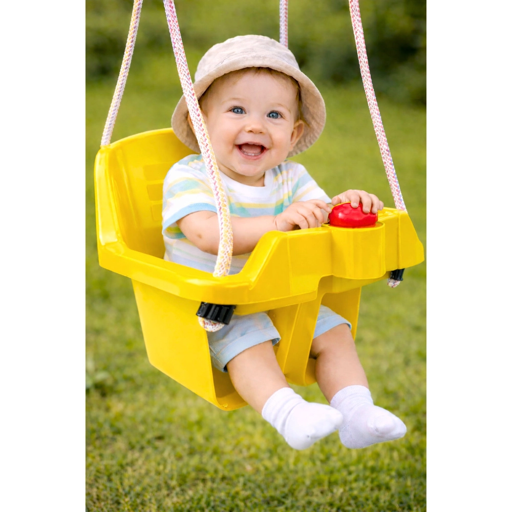 Táto žltá vedierková hojdačka poteší každé batoľa. Hlboké sedadlo s vysokým operadlom a prednou blokáciou drží dieťa v správnej polohe, takže si môže bezpečne užívať hojdanie doma aj vonku. Robustné laná a odolný plast s dlhou životnosťou zvládnu každodenné používanie.