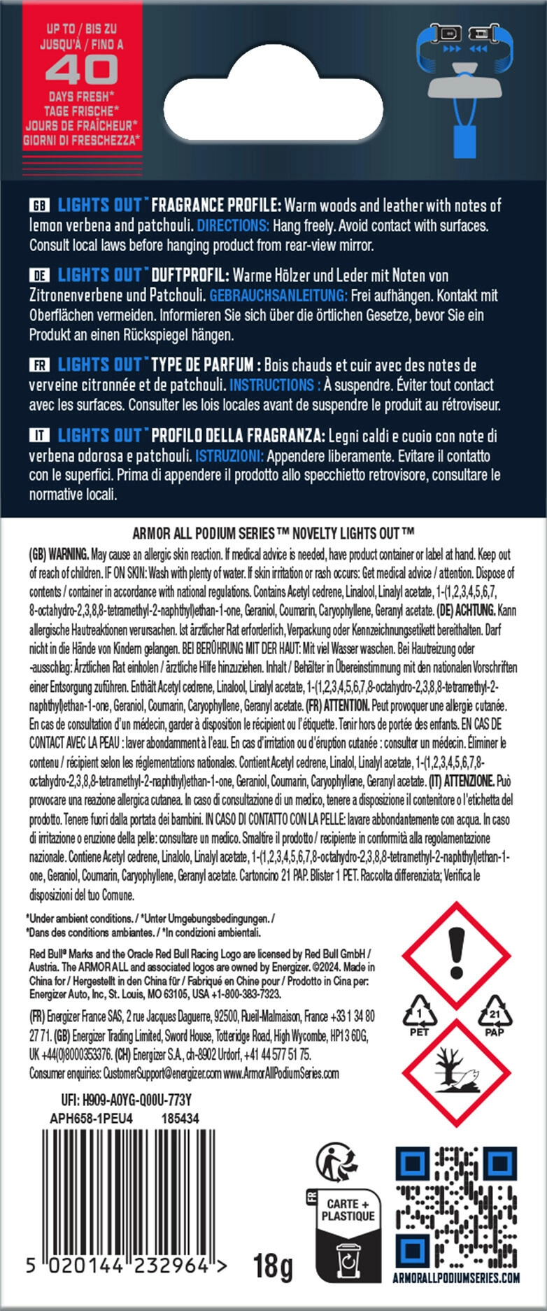 Vytvorte si príjemnú atmosféru v interiéri vozidla s vôňou, ktorá odkazuje na svet rýchlosti a precíznosti. Táto závesná vôňa Armor All Oracle Red Bull Lights Out – All Access Pass bola navrhnutá v spolupráci s Oracle Red Bull Racing a zaujme nielen vzhľadom, ale aj vyváženou kompozíciou aróm.