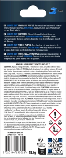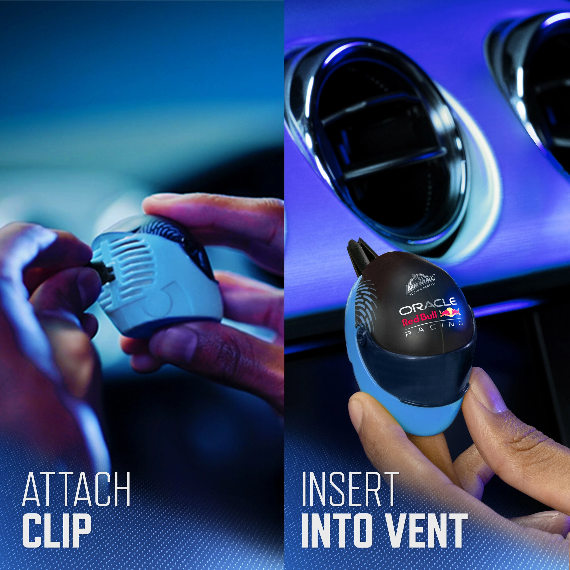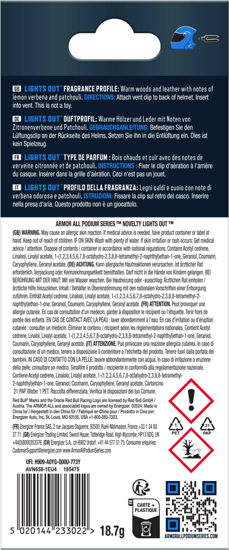 Štýlová 3D vôňa do auta Armor All Oracle Red Bull Lights Out Helmet Vent prináša výraznú a dlhotrvajúcu vôňu v ikonickom dizajne inšpirovanom ORACLE RED BULL RACING. Ľahko sa pripevní do väčšiny ventilácií, ponúka nastaviteľnú intenzitu a okamžite osvieži interiér kombináciou teplého dreva, kože, citrónovej verbeny a pačuli.