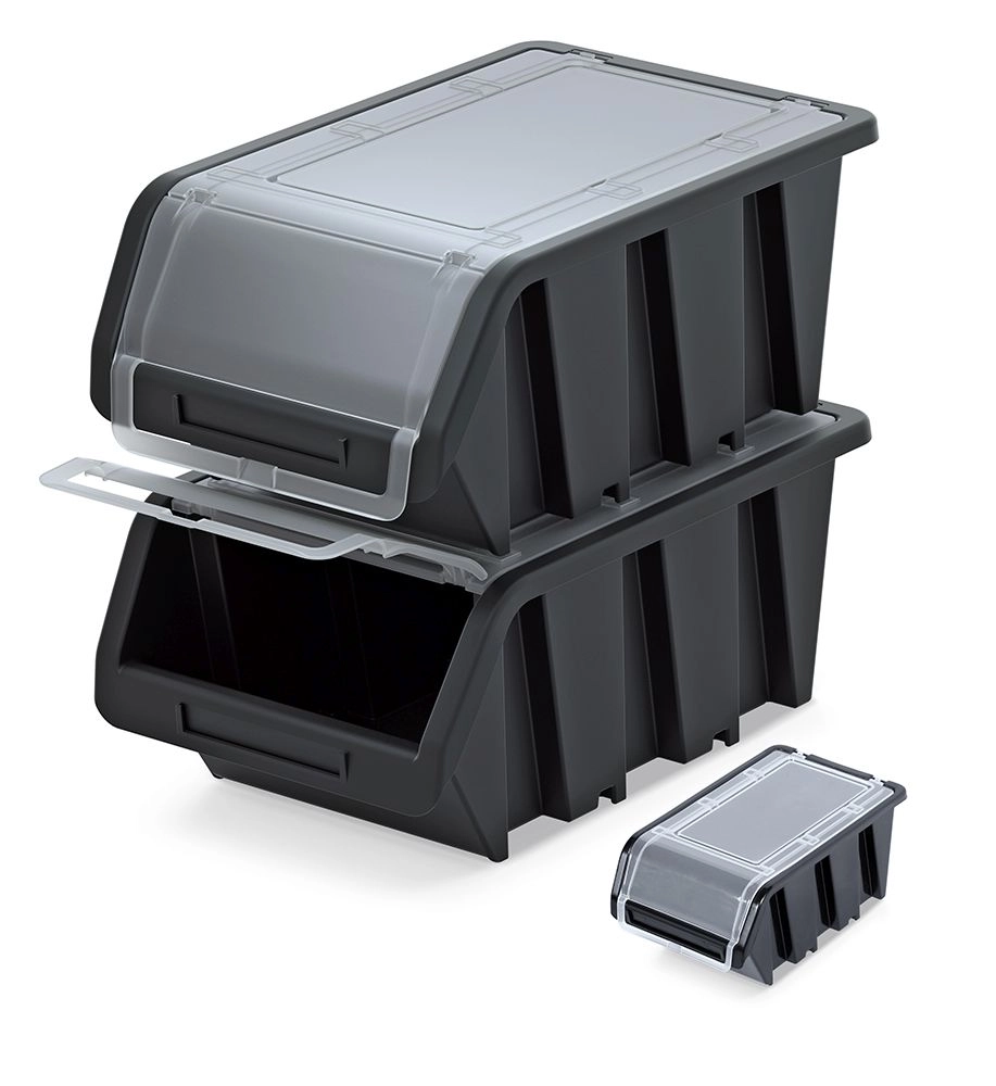 Vďaka stohovateľnému prevedeniu a možnosti nástennej montáže efektívne využijete každý centimeter priestoru. Odolná polymérová zmes zaručuje dlhú životnosť a spoľahlivosť aj pri častom používaní v náročnom prostredí dielní a skladov.