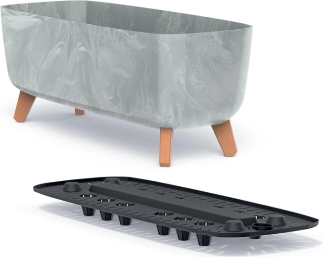 Vyrobený z ľahkého a odolného recyklovaného plastu, ktorý znáša slnko aj dážď a zachováva si farbu vďaka UV stabilizácii. Zvýšené nožičky zabezpečujú stabilitu, podporujú prúdenie vzduchu a vytvárajú priestor na odtok prebytočnej vody.