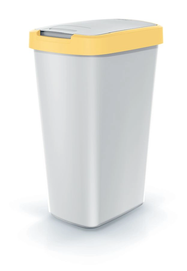 Praktický odpadkový kôš s objemom 45 l v modernej popolavej farbe so svetložltým vekom je ideálny pre domácnosti aj kancelárie. Vďaka úzkemu tvaru sa ľahko zmestí do menších priestorov, klapkové veko s dvomi spôsobmi otvárania zabezpečuje pohodlné a hygienické používanie a estetický rám drží vrecko pevne na mieste. Odolný plast umožňuje jednoduchú údržbu a dlhú životnosť.