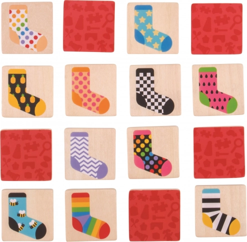 Obohaťte chvíle hier s deťmi pomocou dreveného pexesa s ponožkami. Táto hra stimuluje pamäť a podporuje sústredenie a rozvoj strategických zručností. Všetko, čo potrebujete, je rozložiť 32 drevených hracích dielikov lícom nadol a začať odkrývať dva dieliky súčasne. Obtiažnosť postupne rastie, hráč sa snaží spojiť páry ponožiek a osvojovať si nové stratégie.