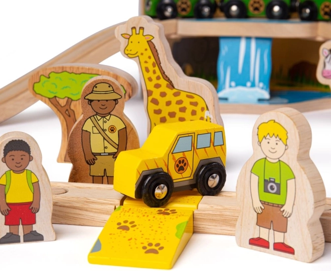 Objavujte svet safari s farebnou a pevnou drevenou vláčkodráhou, ktorá poteší deti od 3 rokov. Set zahŕňa zvieratká ako slon, zebra či opica, stromčeky, značky a most, po ktorom prechádza žltá lokomotíva s dvoma vagónikmi. Vďaka magnetickým spojkám je hra intuitívna a rozšíriteľná.