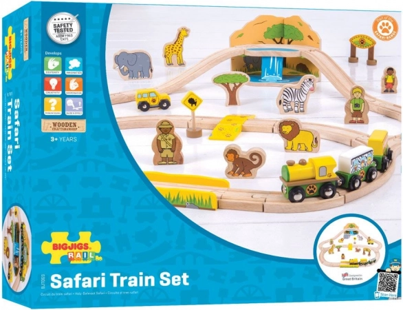 Vydajte sa na dobrodružstvo do divočiny s touto drevenou vláčkodráhou Safari od Bigjigs Rail. Sada s 38 dielmi ponúka kvalitné drevené koľaje, lokomotívu s dvoma vagónikmi, divoké zvieratá aj safari doplnky, ktoré podporujú kreativitu, jemnú motoriku a koordináciu oko–ruka. Magnetické spojky zabezpečia jednoduché prepojenie a kompatibilitu s ďalšími modelmi.