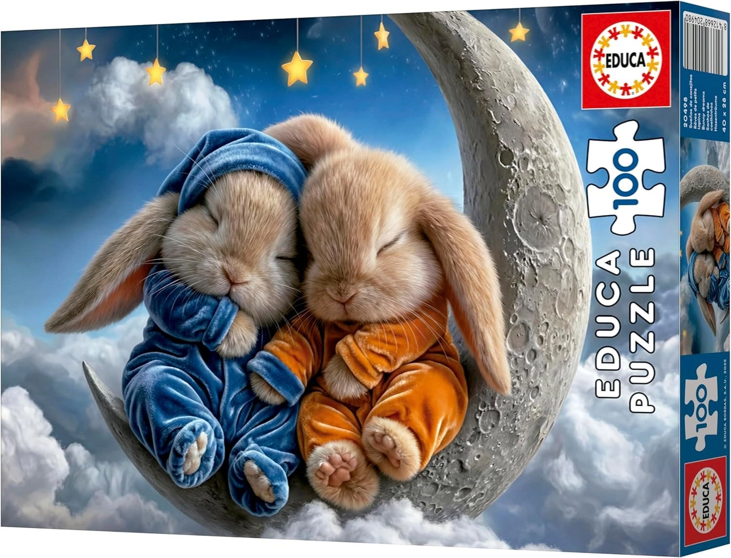 Rozkošné detské puzzle s motívom spiacích zajačikov od značky EDUCA potešia malých staviteľov. Ponúkajú 100 pevných dielikov, väčší formát na jednoduchú manipuláciu a jasné farby, ktoré deti zaujmú na prvý pohľad. Zostavený obrázok má rozmer cca 40 × 28 cm – ideálna zábava aj tréning sústredenia a jemnej motoriky.