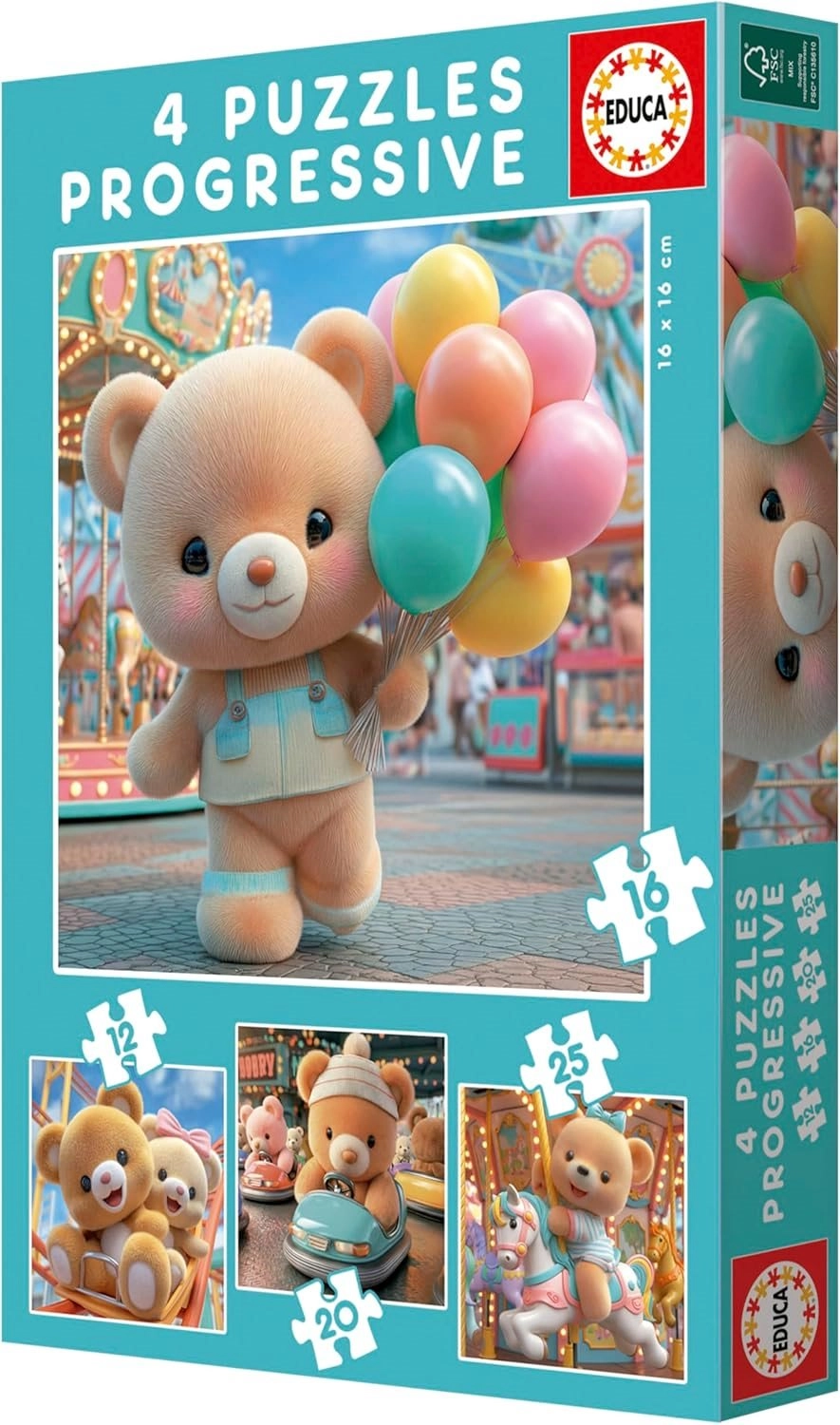 Objavte zábavnú sadu 4v1 progresívnych puzzle EDUCA s roztomilým motívom medvedíka. Každé puzzle má iný počet dielikov (12, 16, 20 a 25), takže deti môžu postupne trénovať jemnú motoriku, logické myslenie a trpezlivosť. Vhodné na prvé skladanie vďaka pevným, dobre uchopiteľným dielikom a kompaktnému rozmeru cca 16 × 16 cm po zložení.