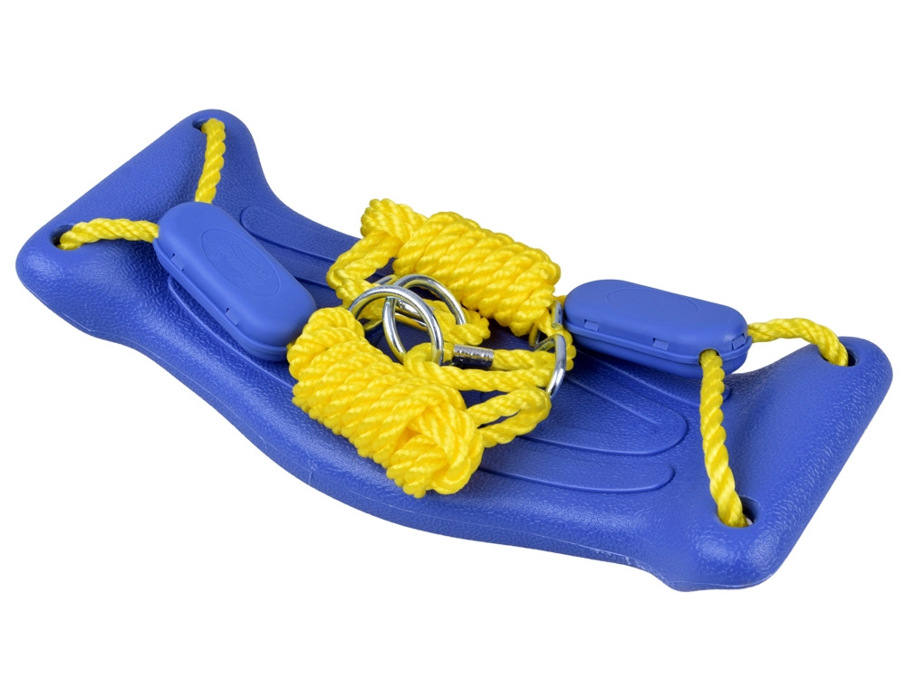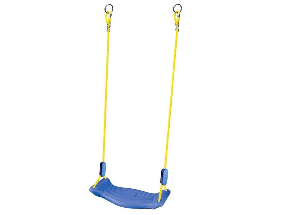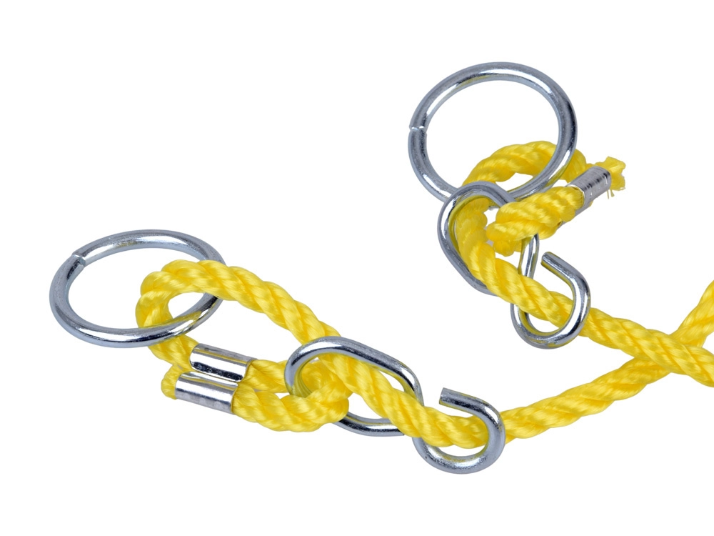 Silné žlté laná s plastovými sponami umožňujú ľahké nastavenie dĺžky a presné vyrovnanie hojdačky. Kovové krúžky a háčiky urýchlia montáž.