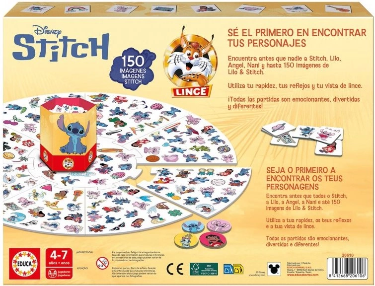 Rodinná postrehová hra LYNX – Stitch od EDUCA preverí tvoje oči aj rýchle reakcie. Na hernej ploche hľadaj svoje kartičky medzi 150 obrázkami a buď prvý, kto ich všetky nájde. Jednoduché pravidlá, rýchla hrateľnosť a zábava pre celú rodinu – trénuje pozornosť, koordináciu oko–ruka aj reflexy.